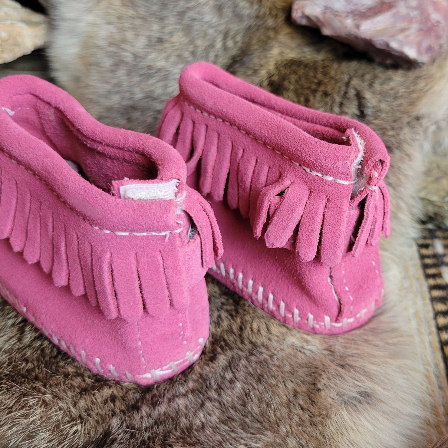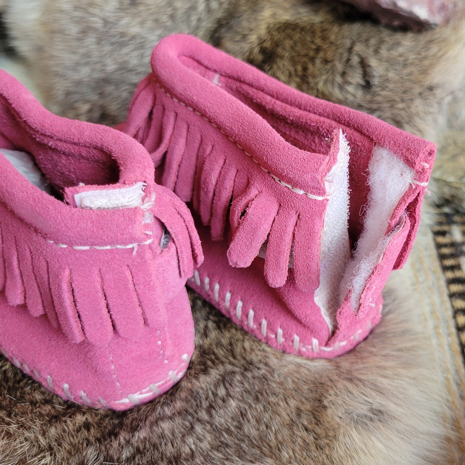 Your little darling will adore these sweet fringe infant moccasins. Soft suede leather keeps little toes warm, while the velcro promises easy on and off and a padded insole provides comfort as your little one learns to walk.