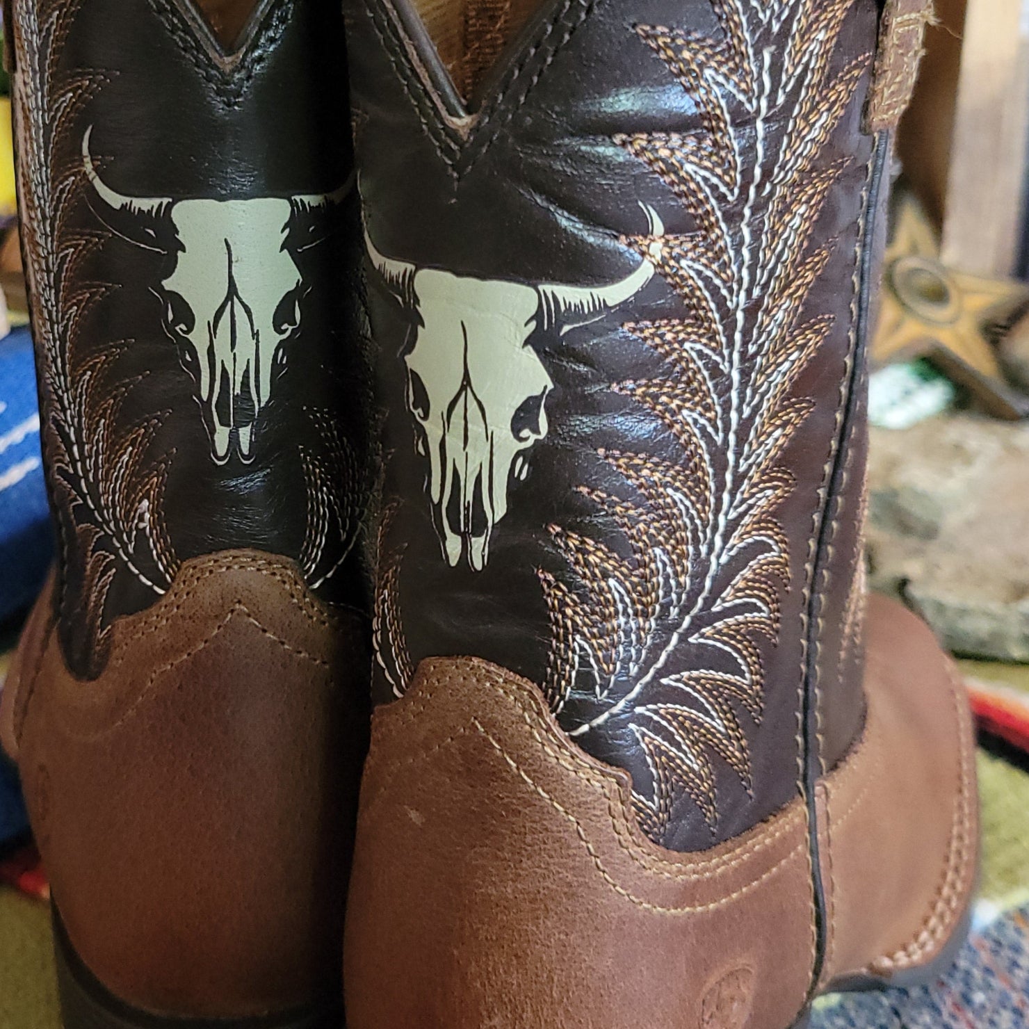 This kids' leather boot "Stampede" by Ariat combine durability with distinctive western style. Featuring a square toe crafted from leather, the boots offer a comfortable fit and lasting wear. The dark brown shaft showcases an intricate cow skull detail and expertly stitched patterns, perfect for young adventurers on the trail.