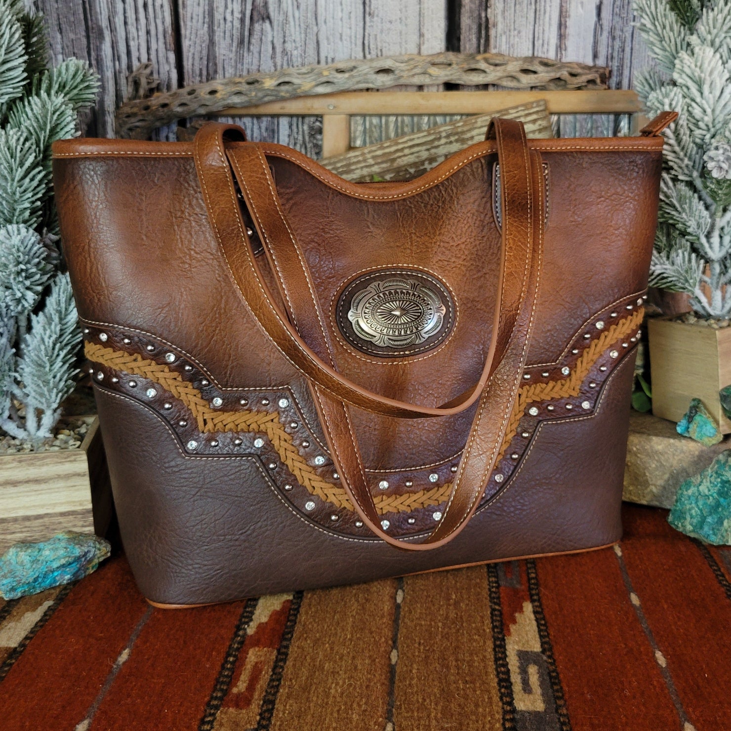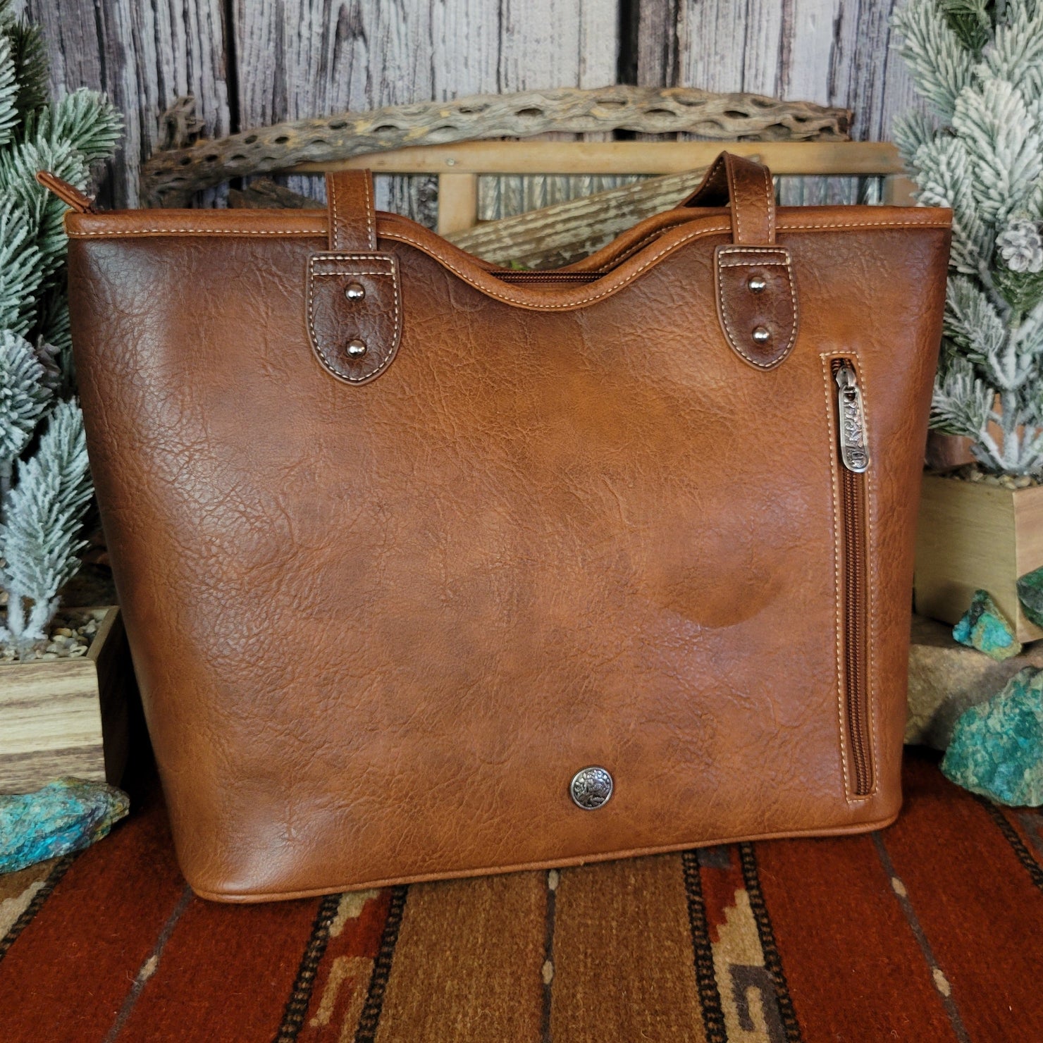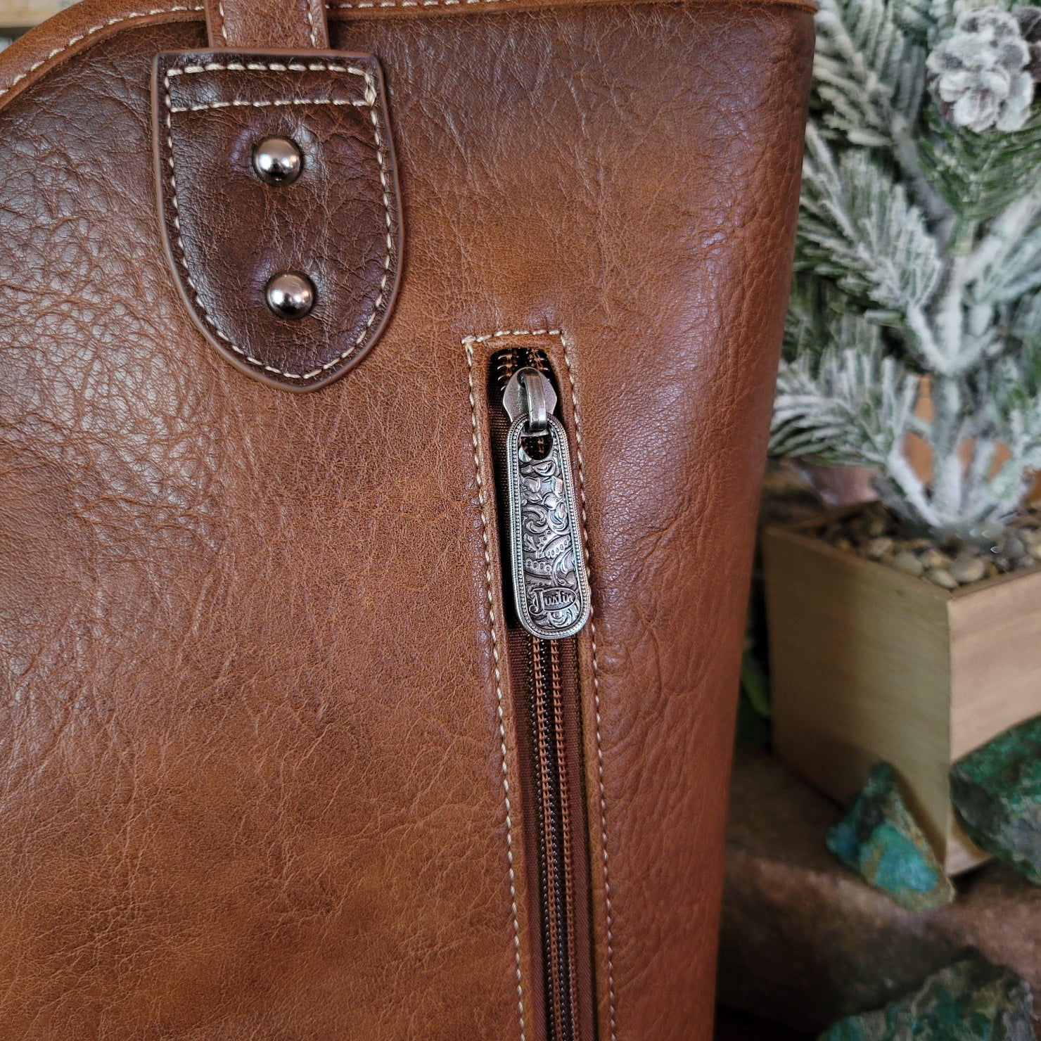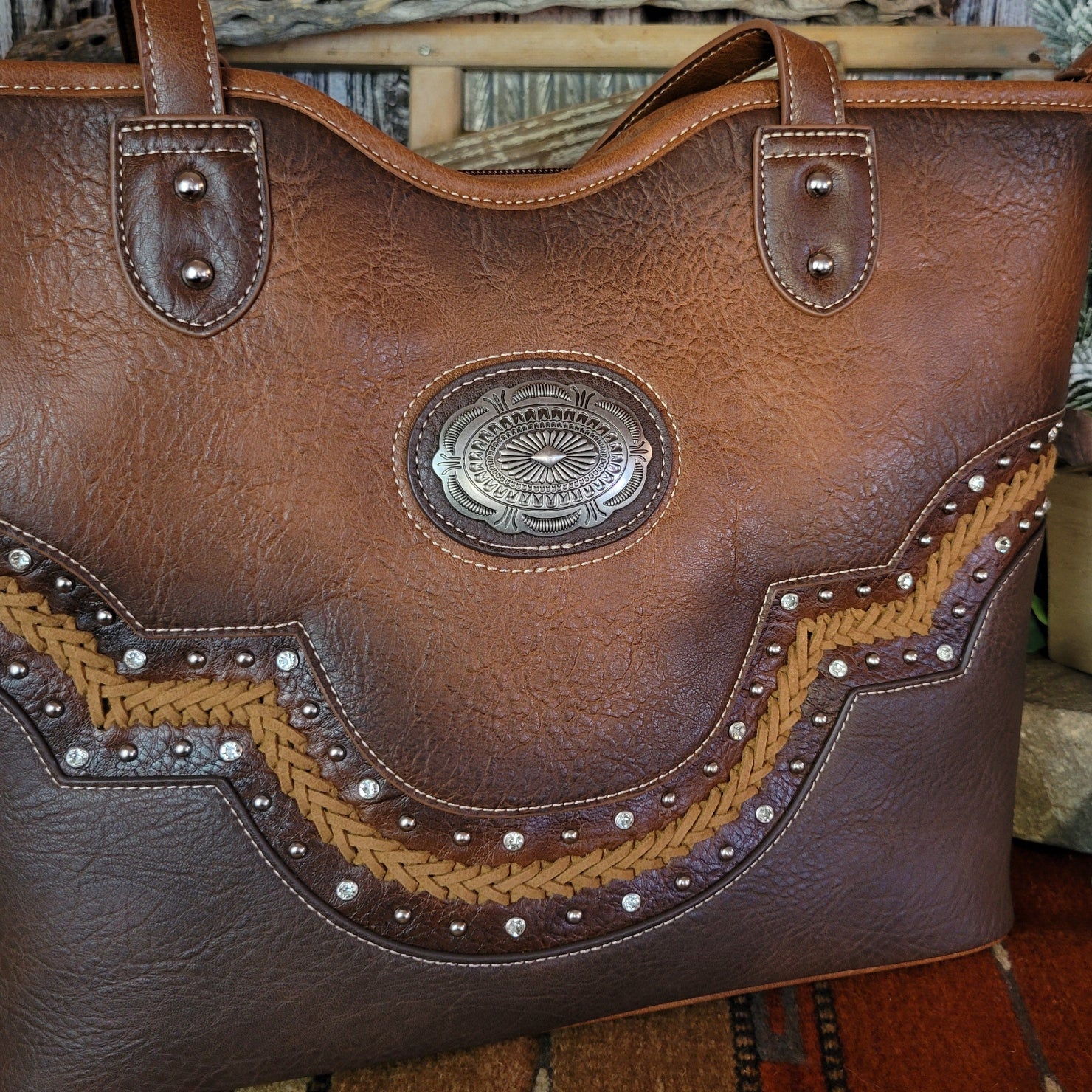 This tote by Justin combines practical concealed carry functionality with eye-catching rhinestone embellishments. All crafted from durable vegan leather, the concealed carry pocket keeps essentials secure while the sparkling design and whipstitch detailing makes a bold statement wherever your day takes you.