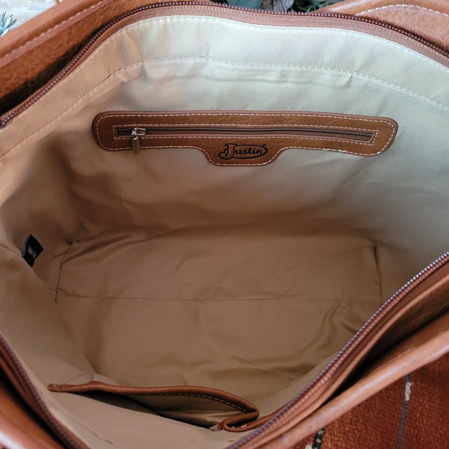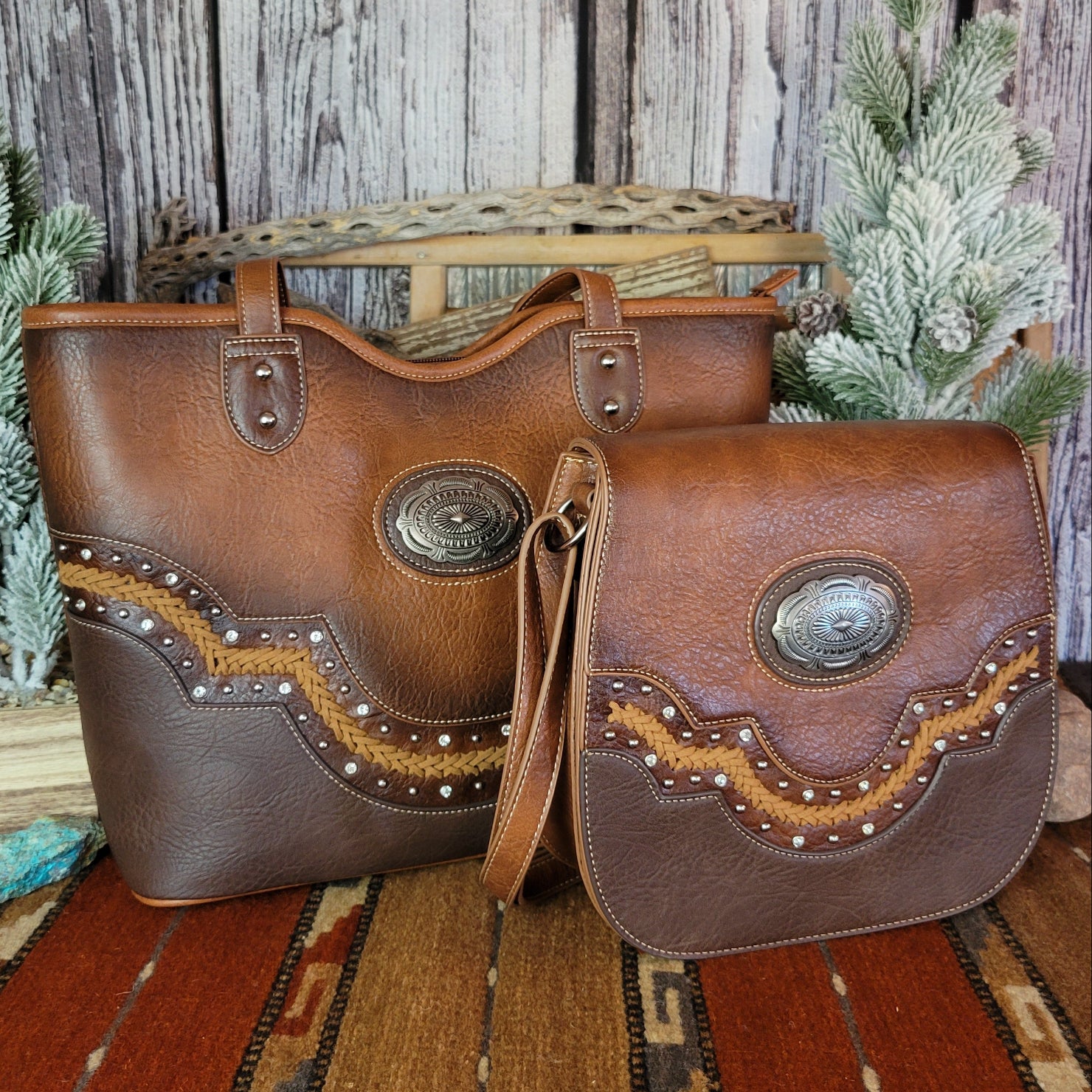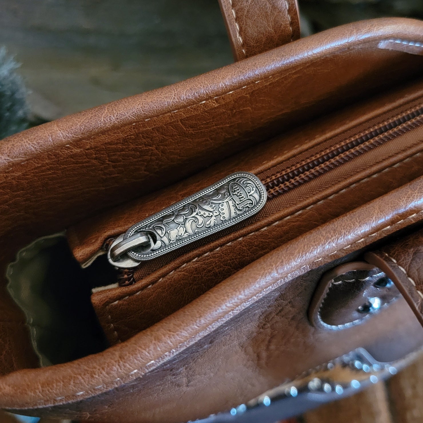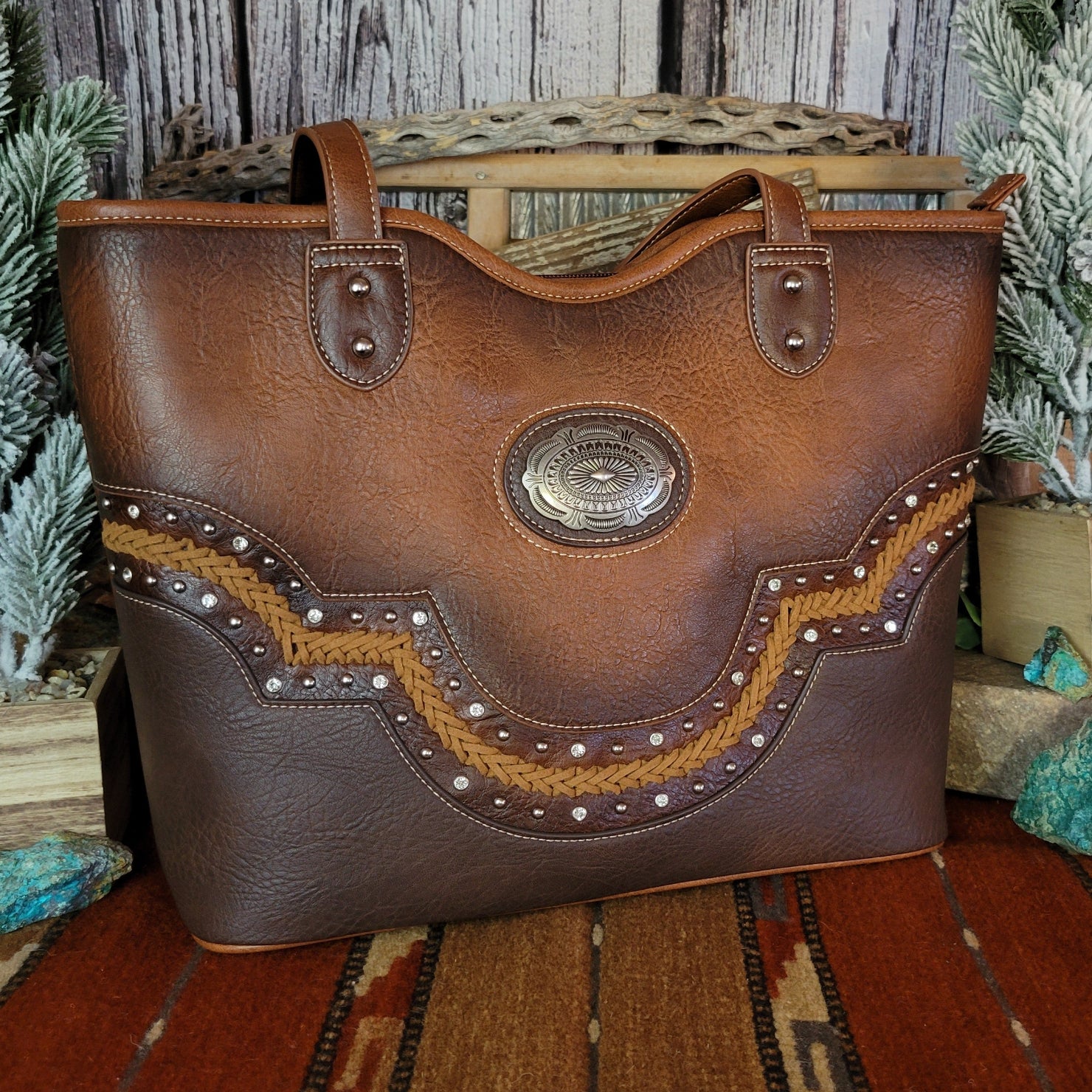 This tote by Justin combines practical concealed carry functionality with eye-catching rhinestone embellishments. All crafted from durable vegan leather, the concealed carry pocket keeps essentials secure while the sparkling design and whipstitch detailing makes a bold statement wherever your day takes you.