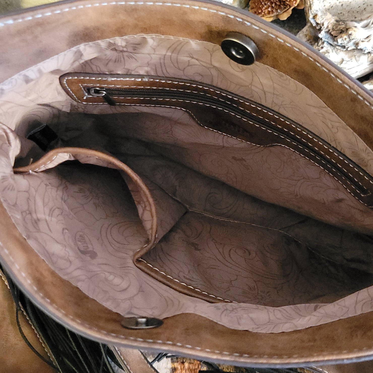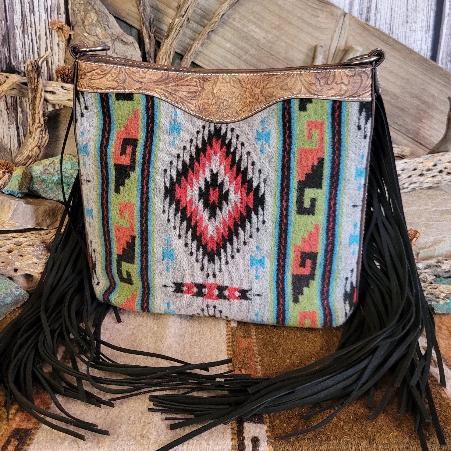 This women's concealed carry purse by Justin combines rugged style with practical security. Crafted from rich leather, it features a multicolored western blanket detail on the front and striking black fringe accents. Designed for discreet protection, it includes dual concealed carry zippers and an adjustable strap for a customized fit.