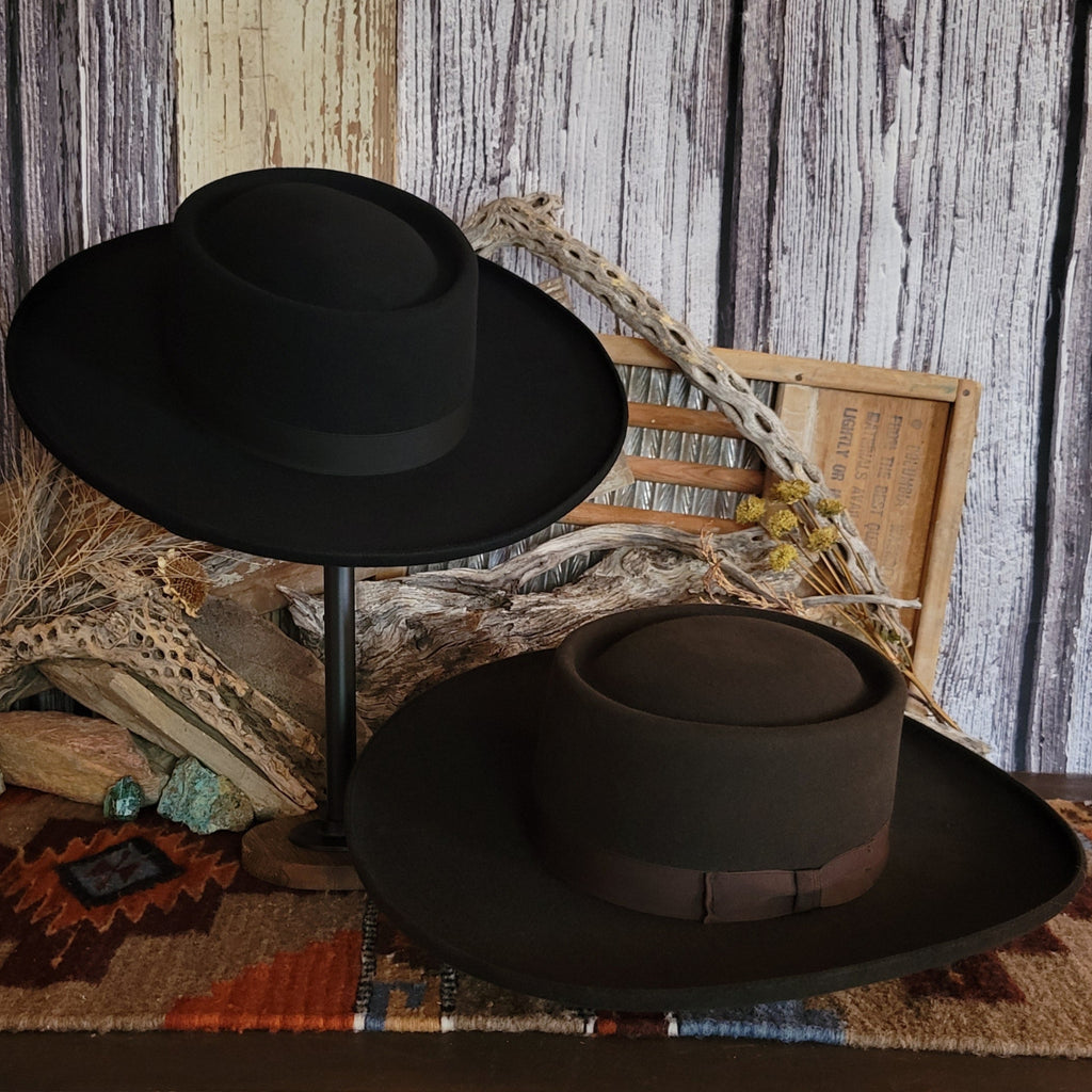 Black  5X beaver fur brick style hat on fence post in front of a cantina