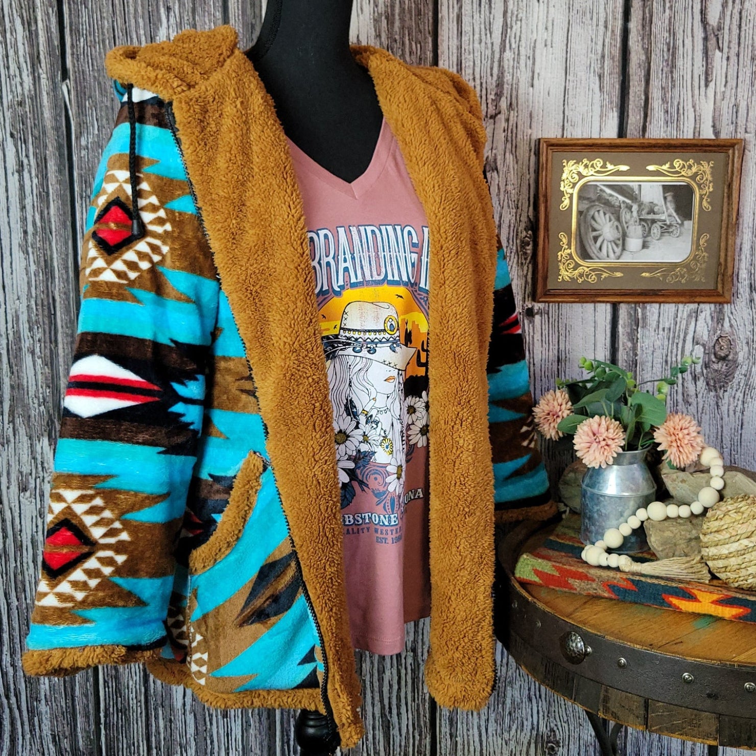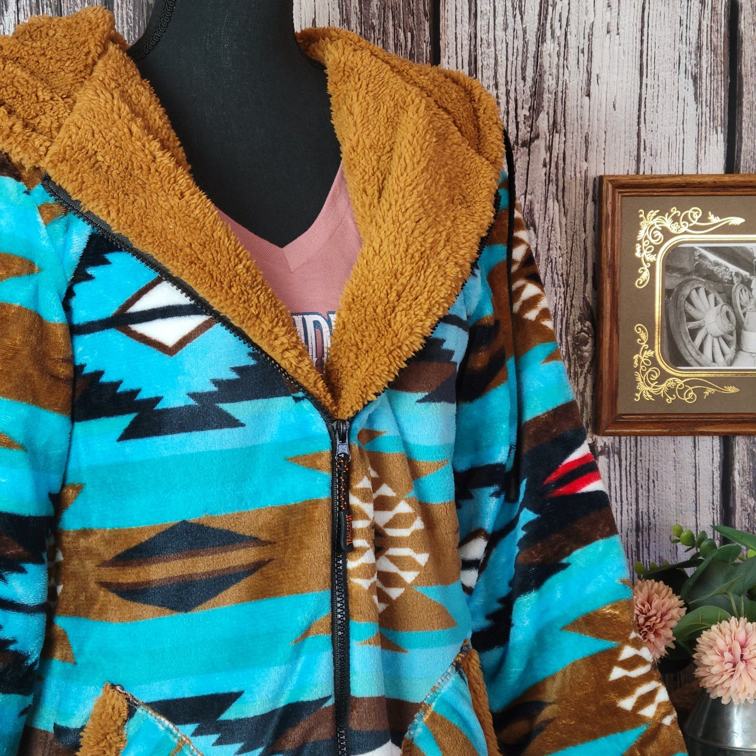 All Weather Outwear's fleece jackets deliver warmth and style with their plush, soft construction and eye-catching Aztec patterns. Available in brown or vibrant turquoise, each option brings southwestern character to your layering wardrobe.