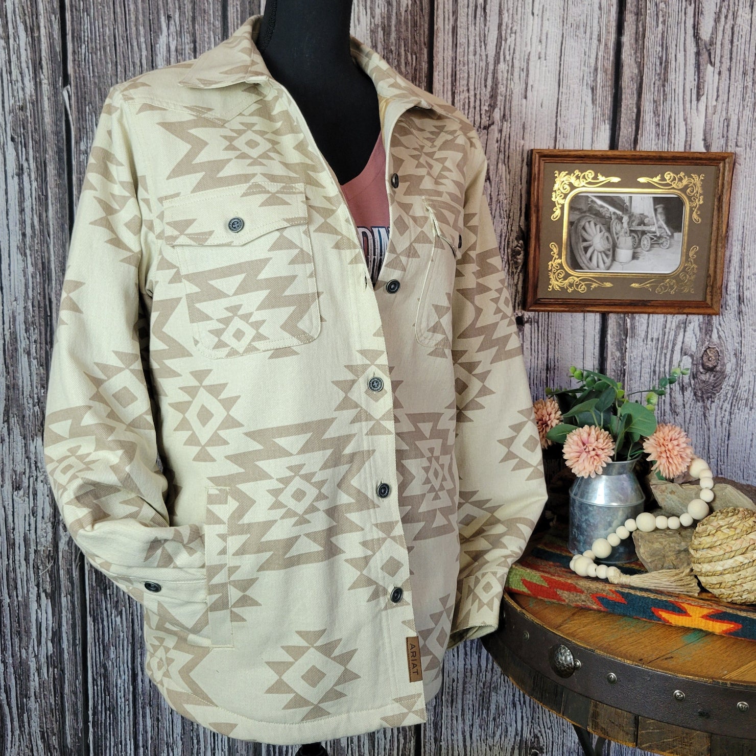This insulted shirt jacket by Ariat comes in a cream color and is made from 100% cotton. The interior is lined and the southwestern designs make it a perfect addition for layering out on the trails.