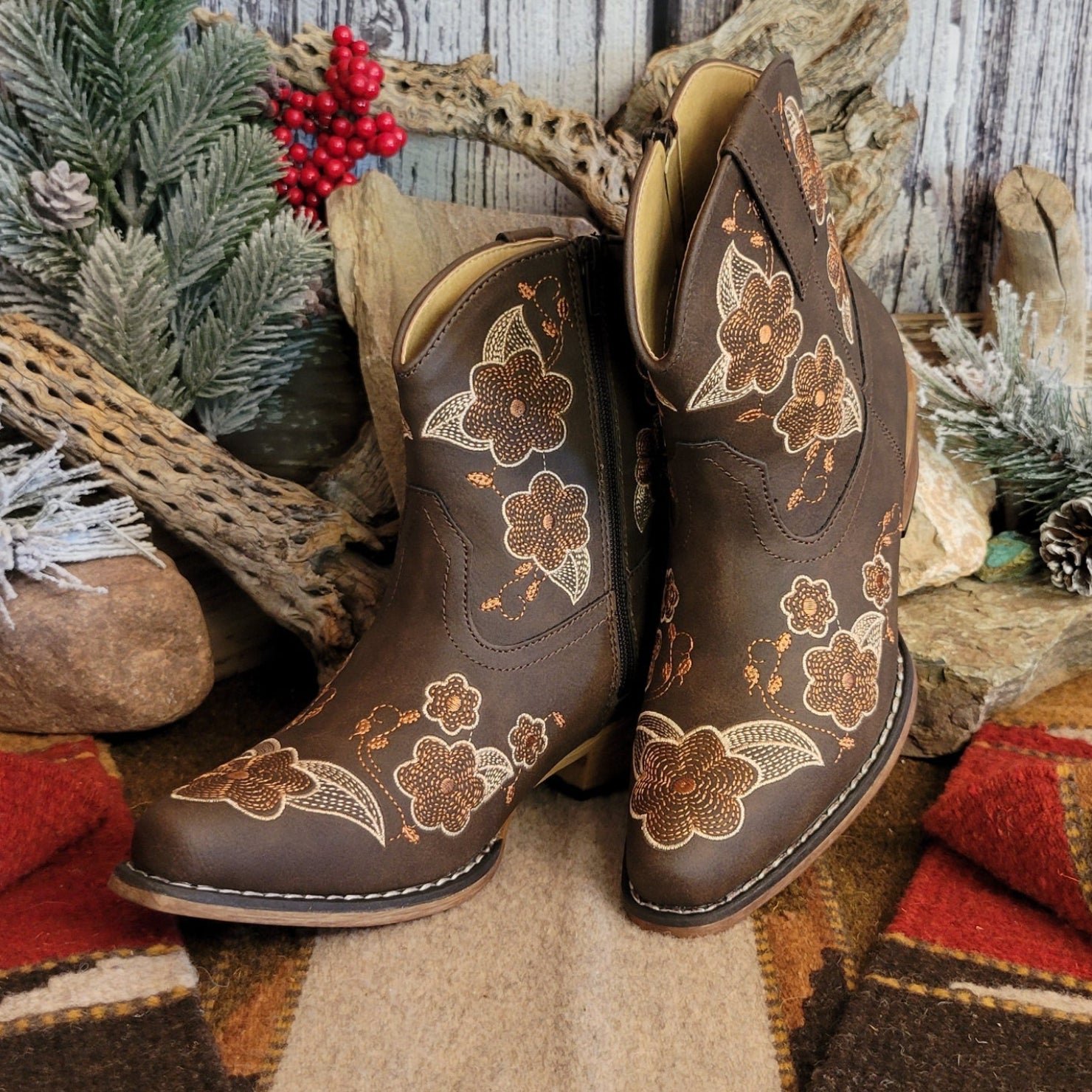 These women's "Wildflower" boots by Roper blend western heritage with artistic flair, featuring faux brown leather adorned with embossed wildflower designs. The snip toe silhouette and rustic finish deliver timeless style that captures the spirit of the frontier.