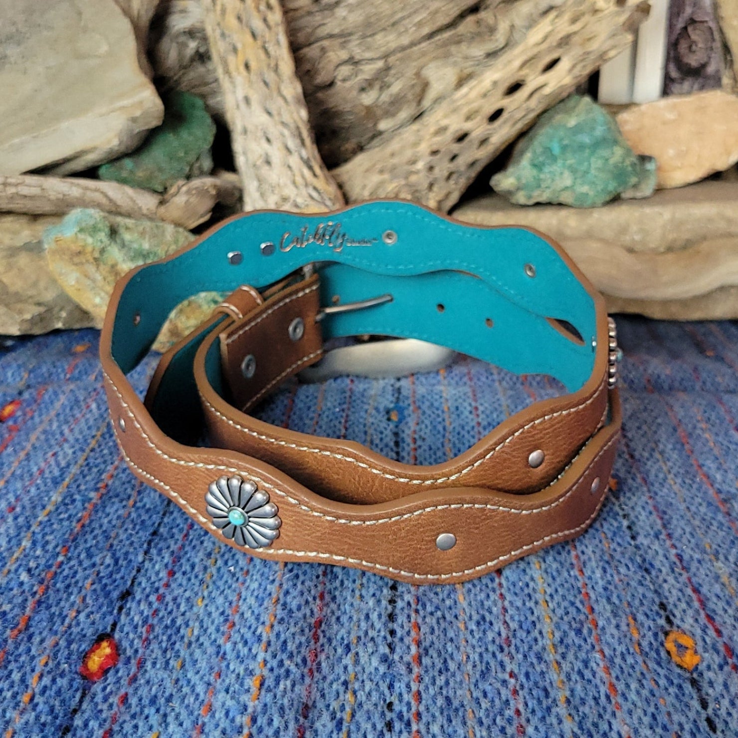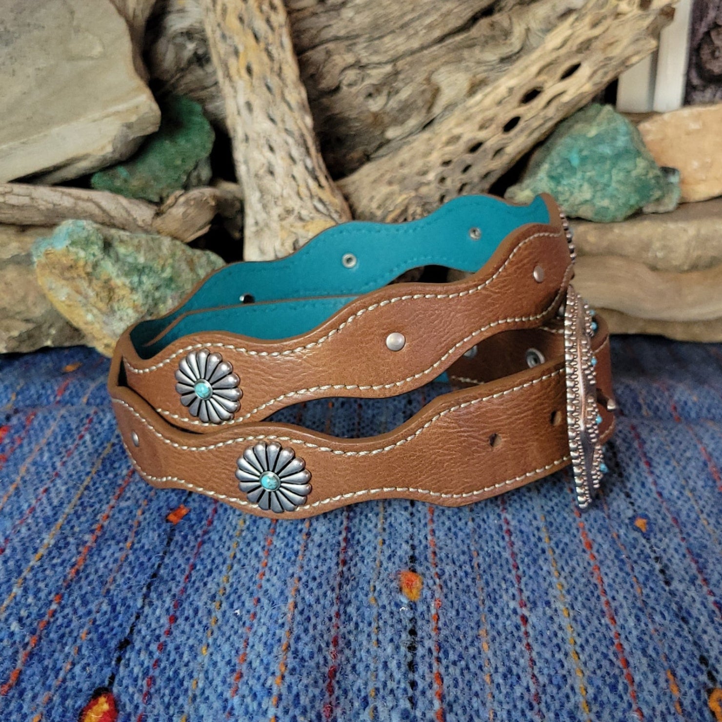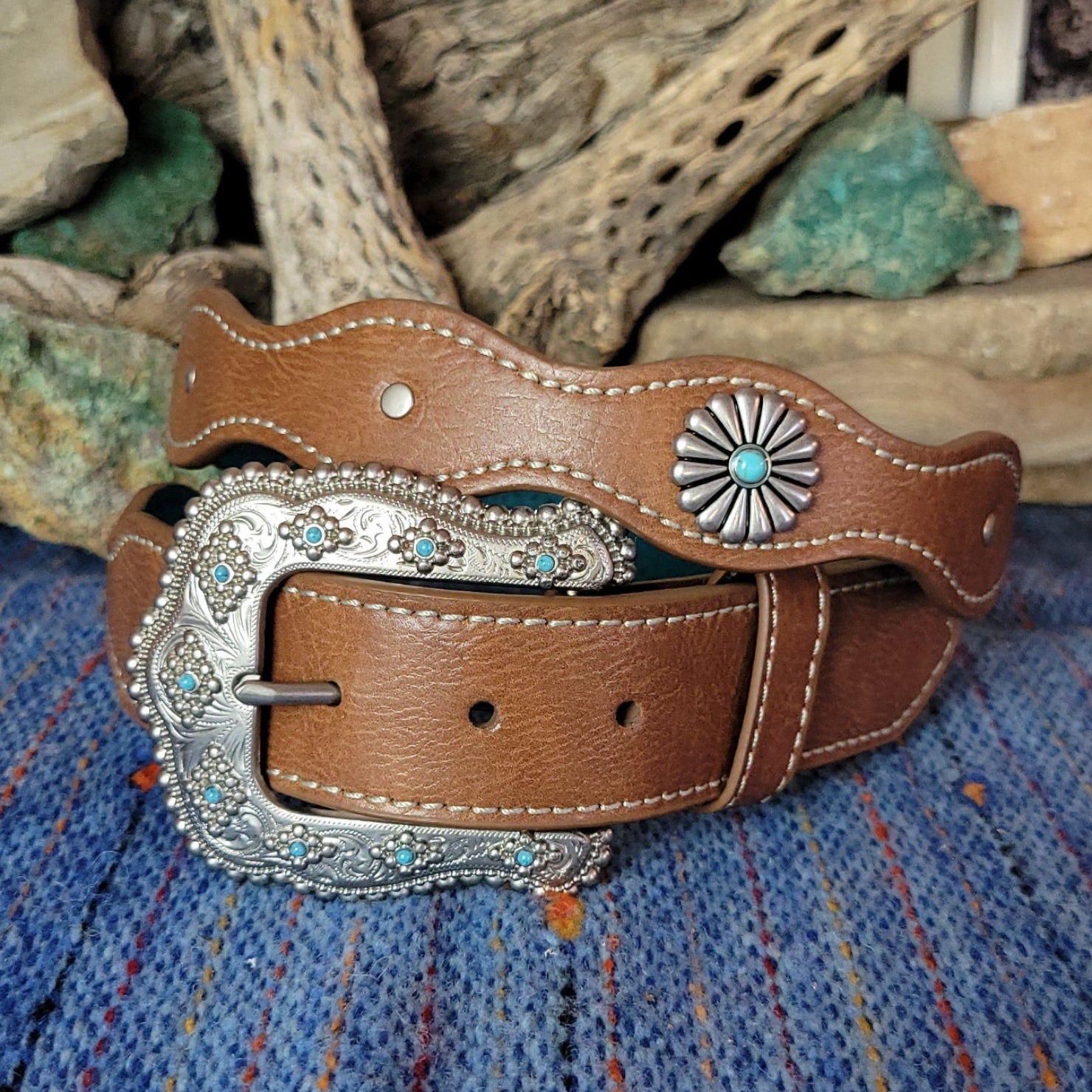 The flower concho leather belt by Catchfly exemplifies the southwest with its brown leather adorned with decorative flower conchos spaced along the length and accented with vibrant turquoise details.