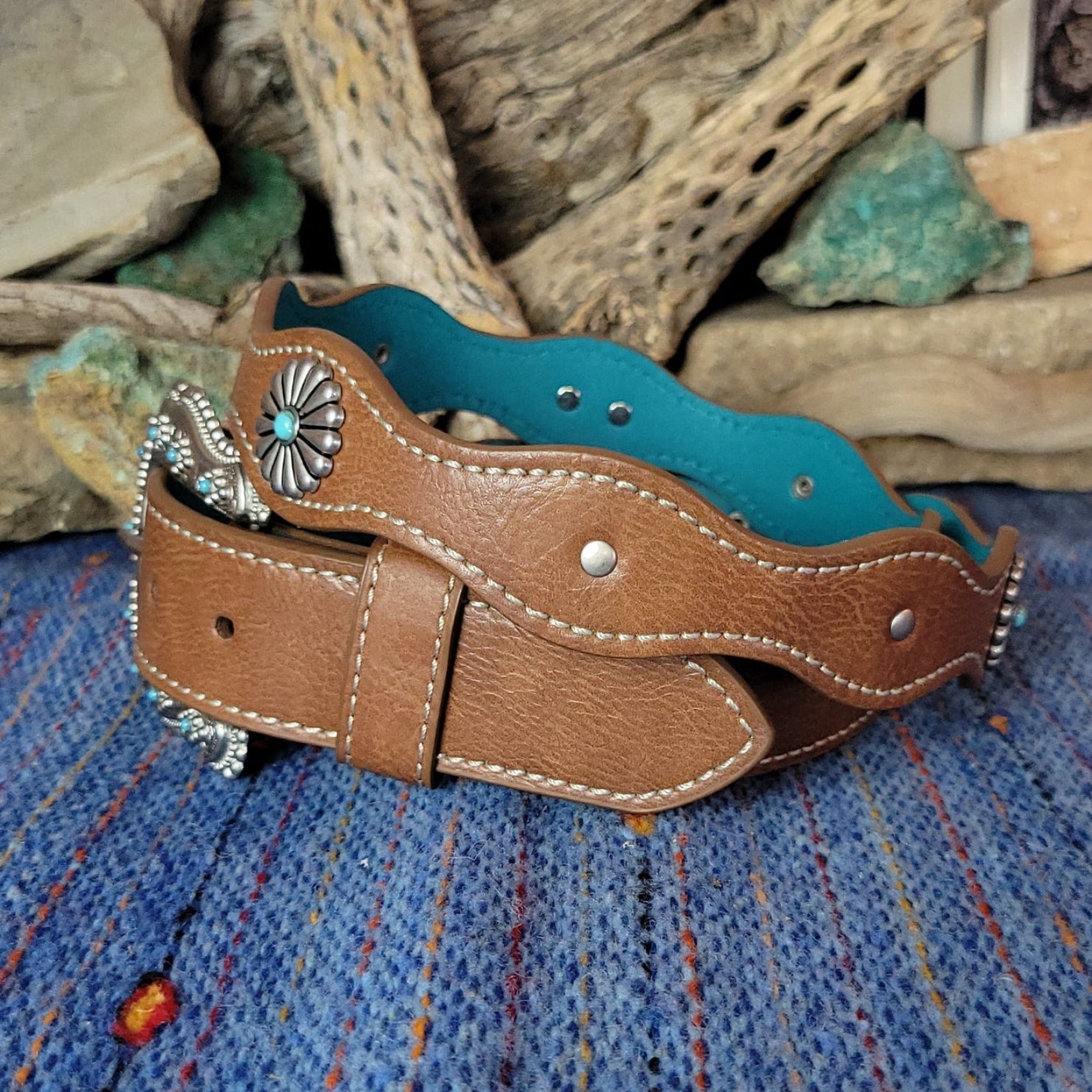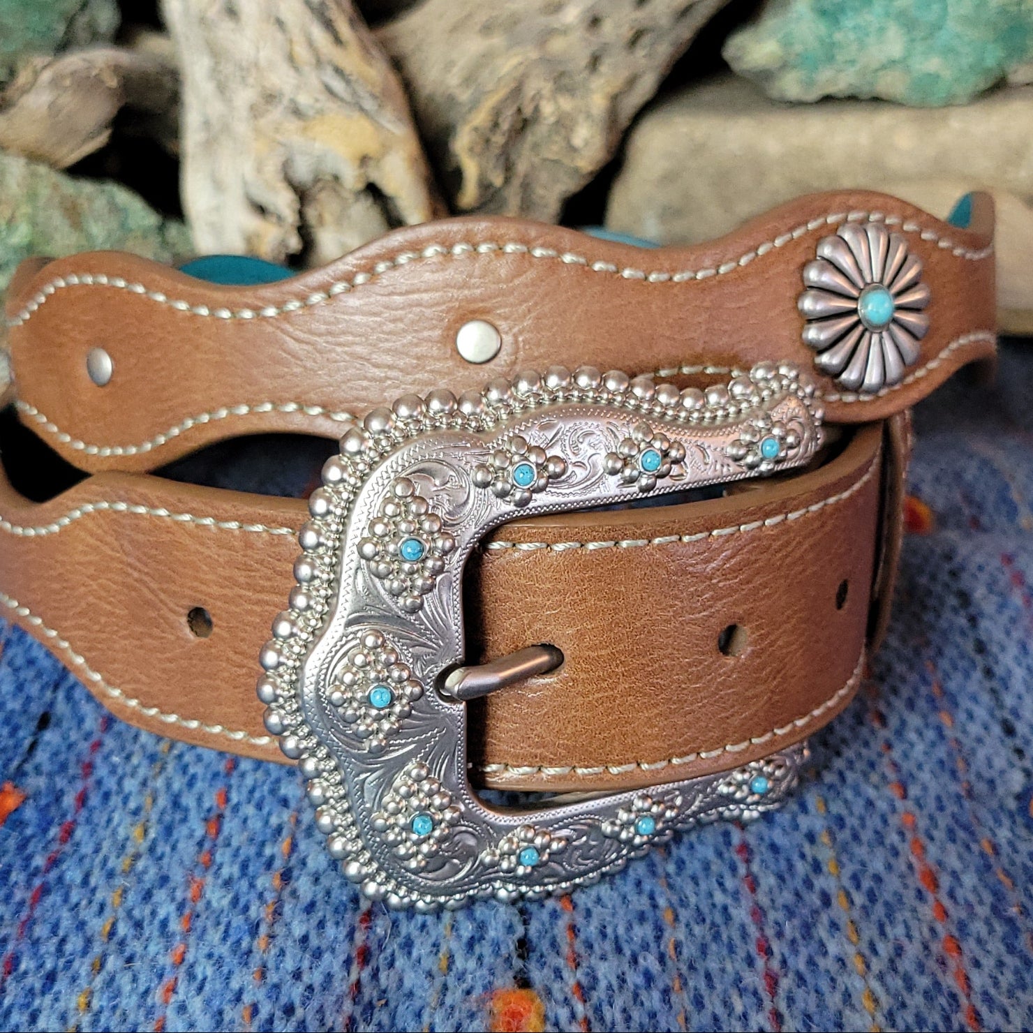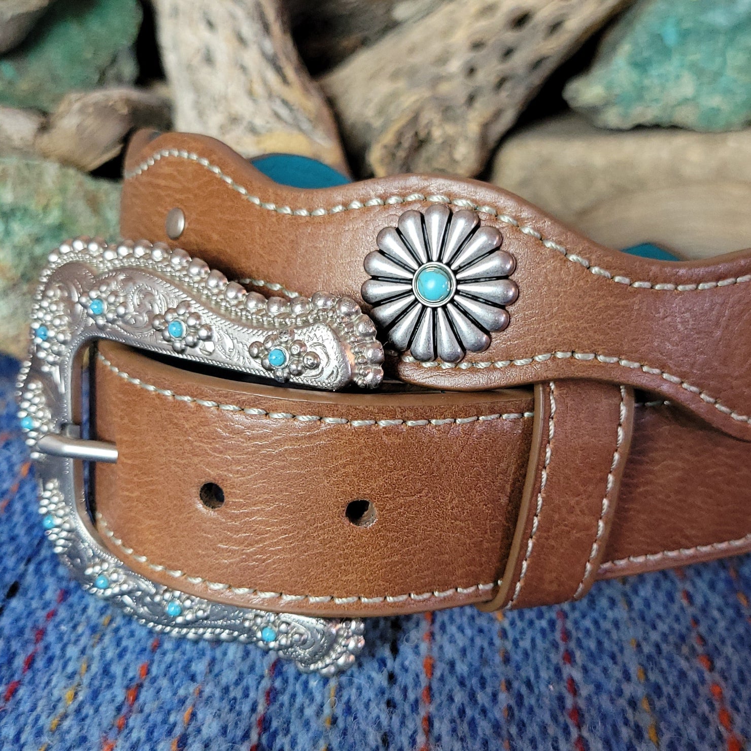 The flower concho leather belt by Catchfly exemplifies the southwest with its brown leather adorned with decorative flower conchos spaced along the length and accented with vibrant turquoise details.
