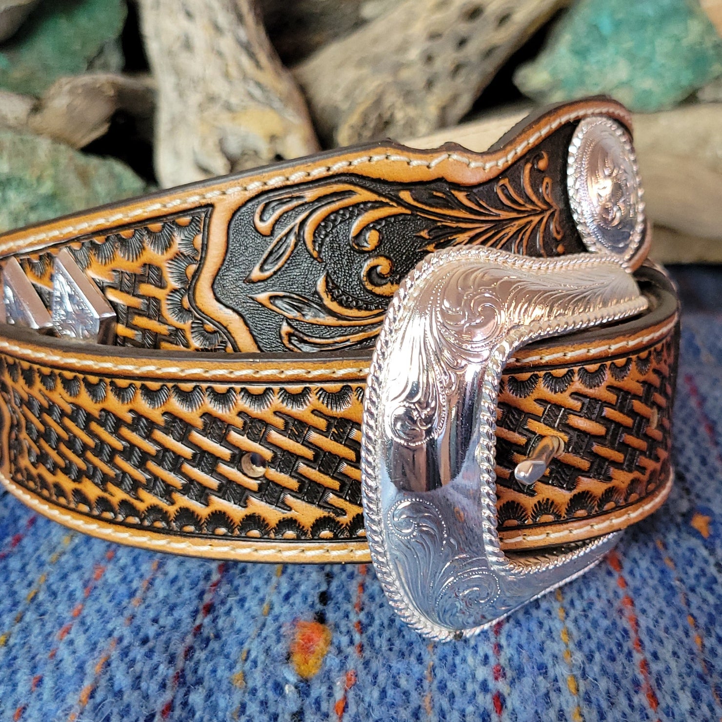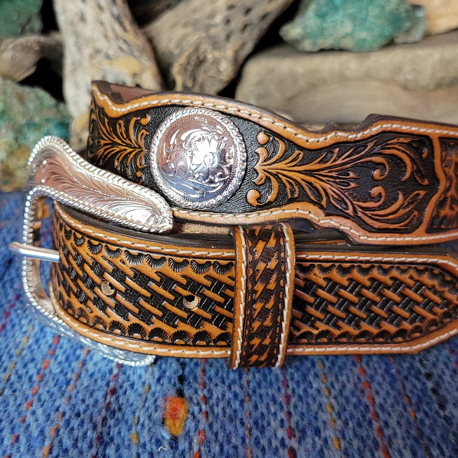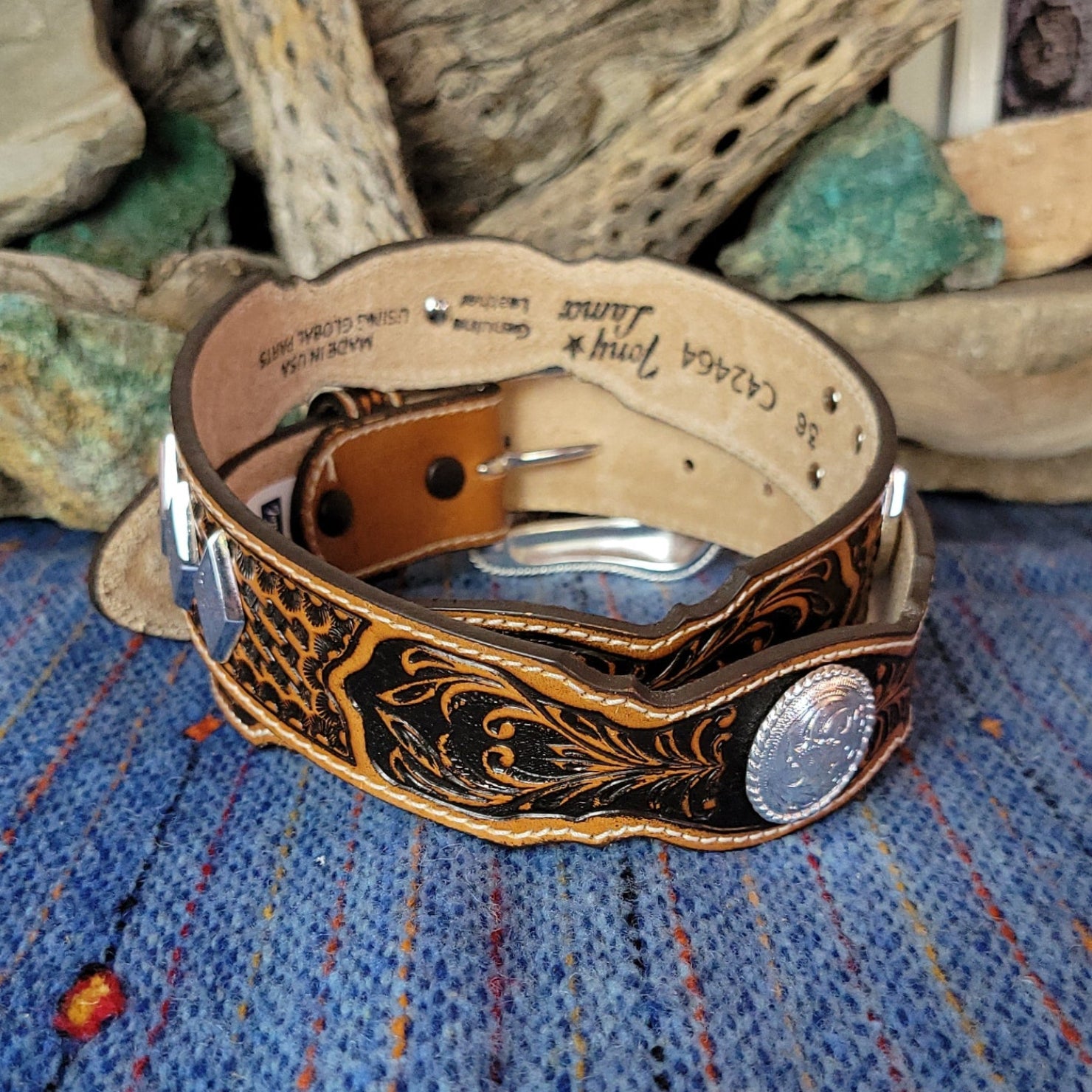 The "Stillwater Creek" leather belt by Tony Lama presents masterful western craftsmanship with its tan leather showcasing intricate hand-tooled designs and silver accents throughout. Featuring a removable buckle system, this belt offers versatility and longevity for the trails.