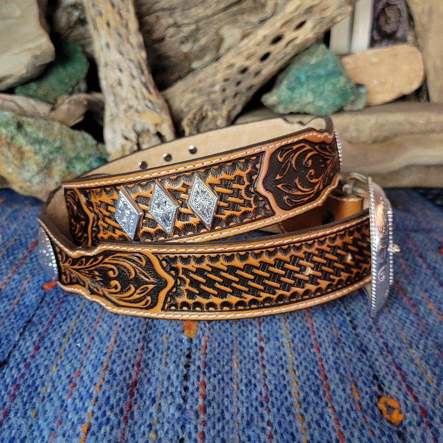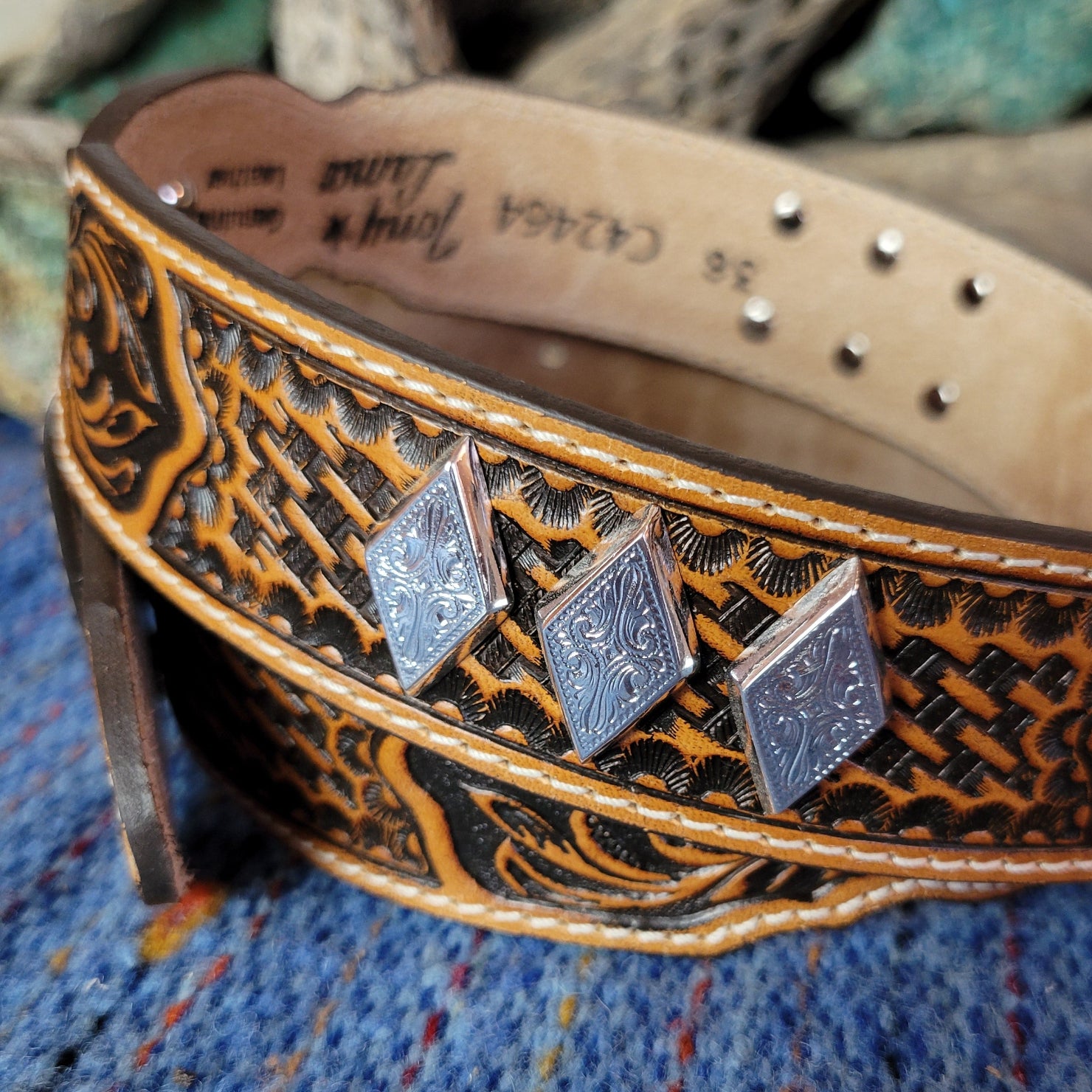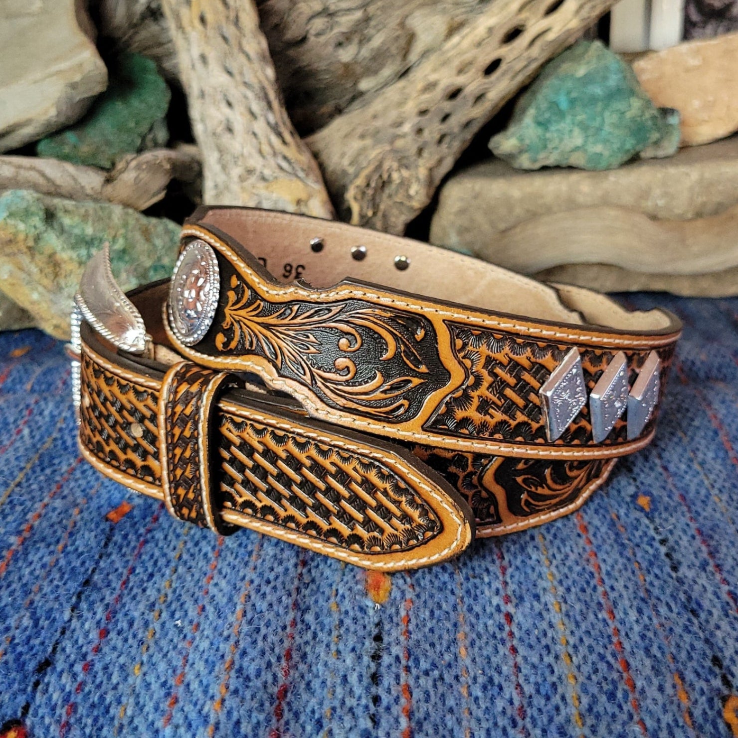 The "Stillwater Creek" leather belt by Tony Lama presents masterful western craftsmanship with its tan leather showcasing intricate hand-tooled designs and silver accents throughout. Featuring a removable buckle system, this belt offers versatility and longevity for the trails.