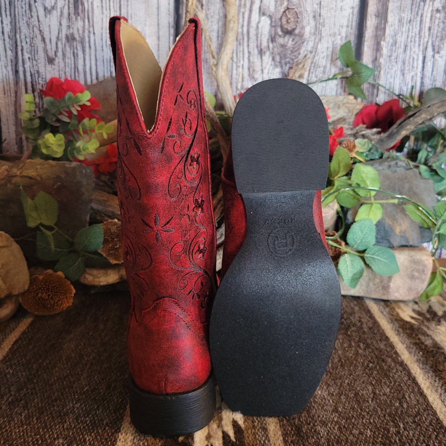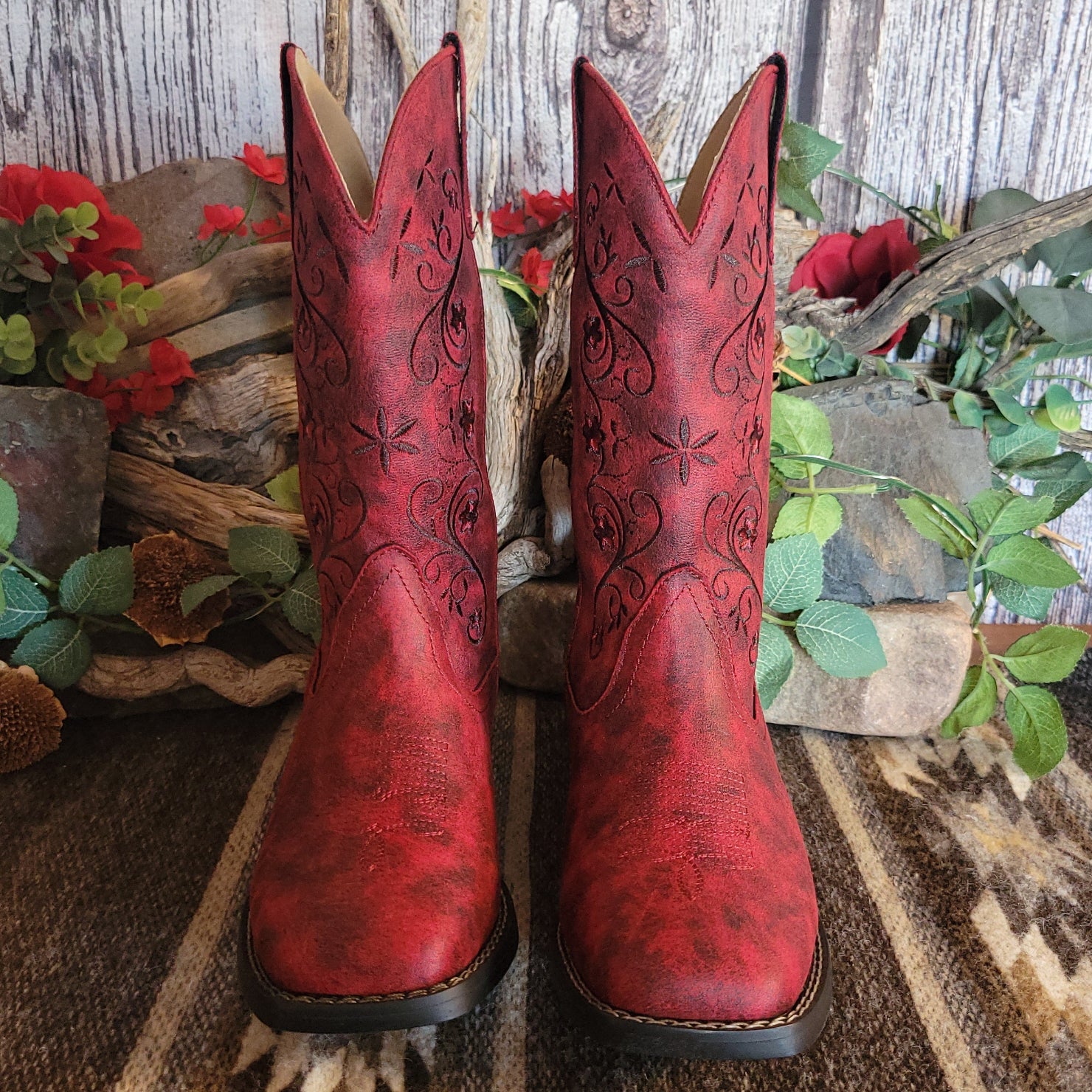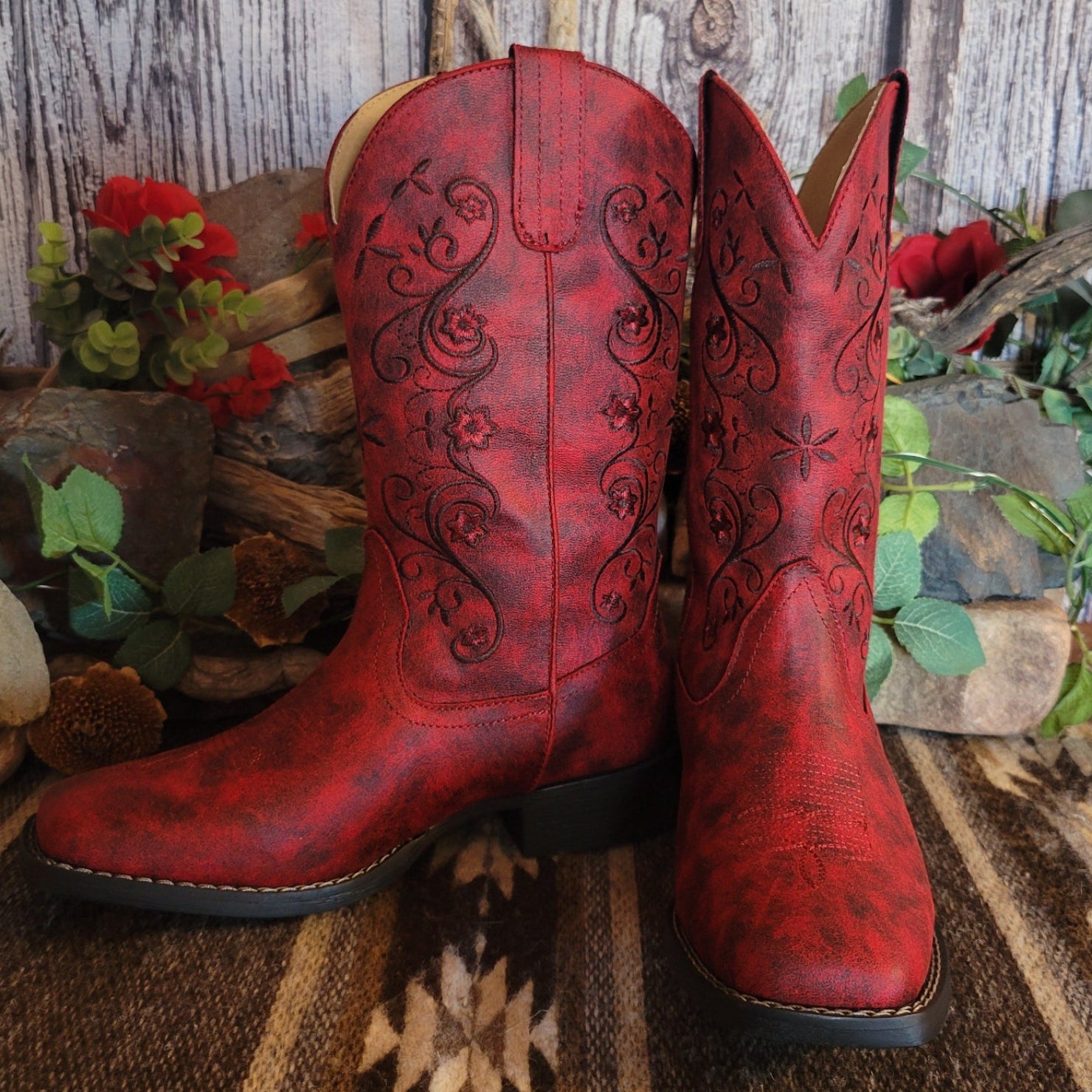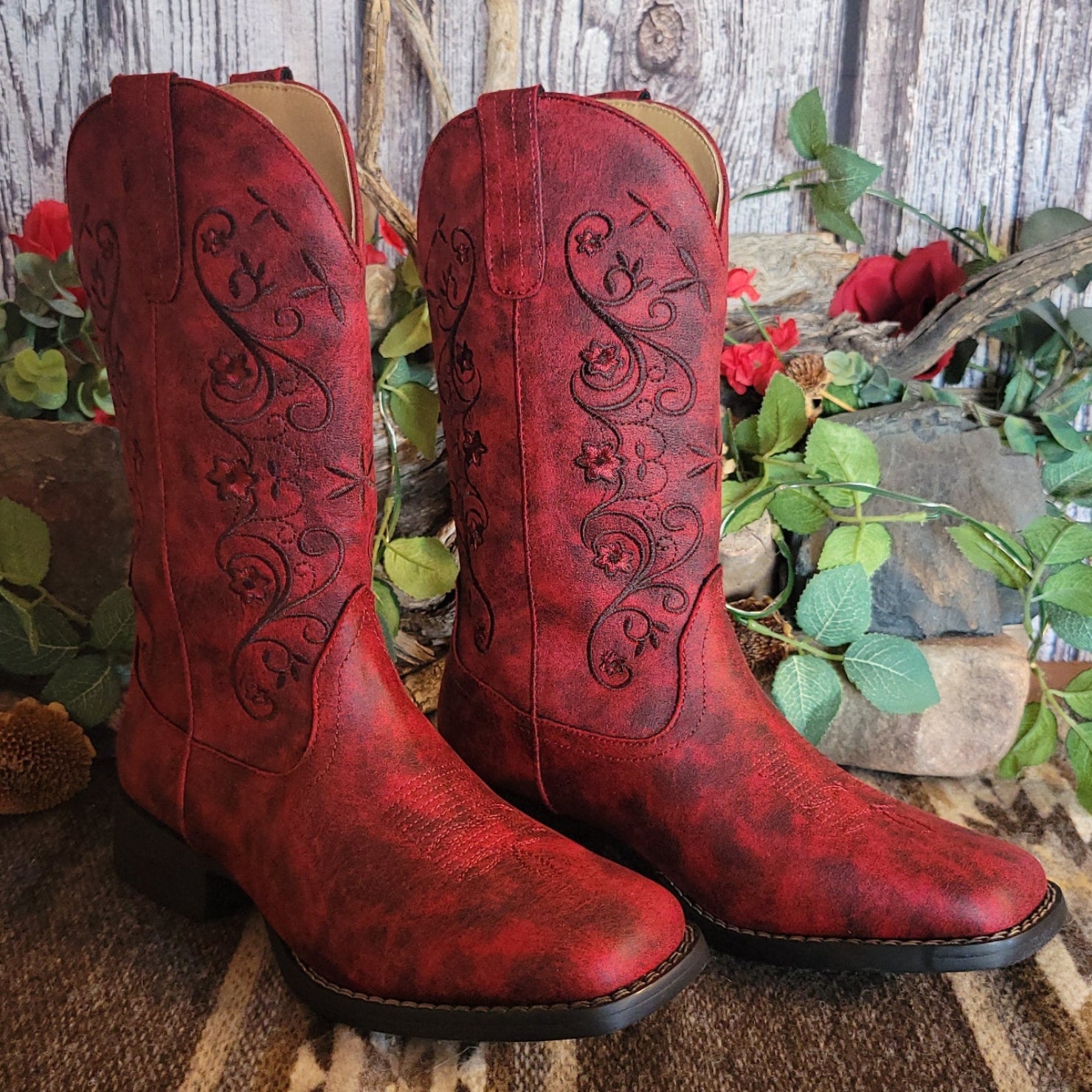 The "Bailey" boot from Roper delivers authentic western style with rich red leather and intricate stitched detailing that captures the spirit of classic ranch wear. The square toe construction provides a traditional silhouette while ornate embroidery adds distinctive character to every step.