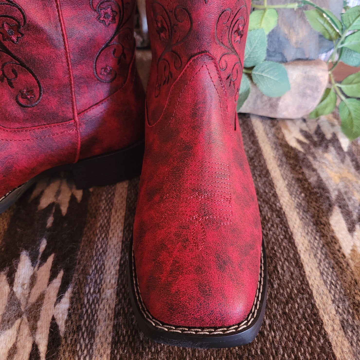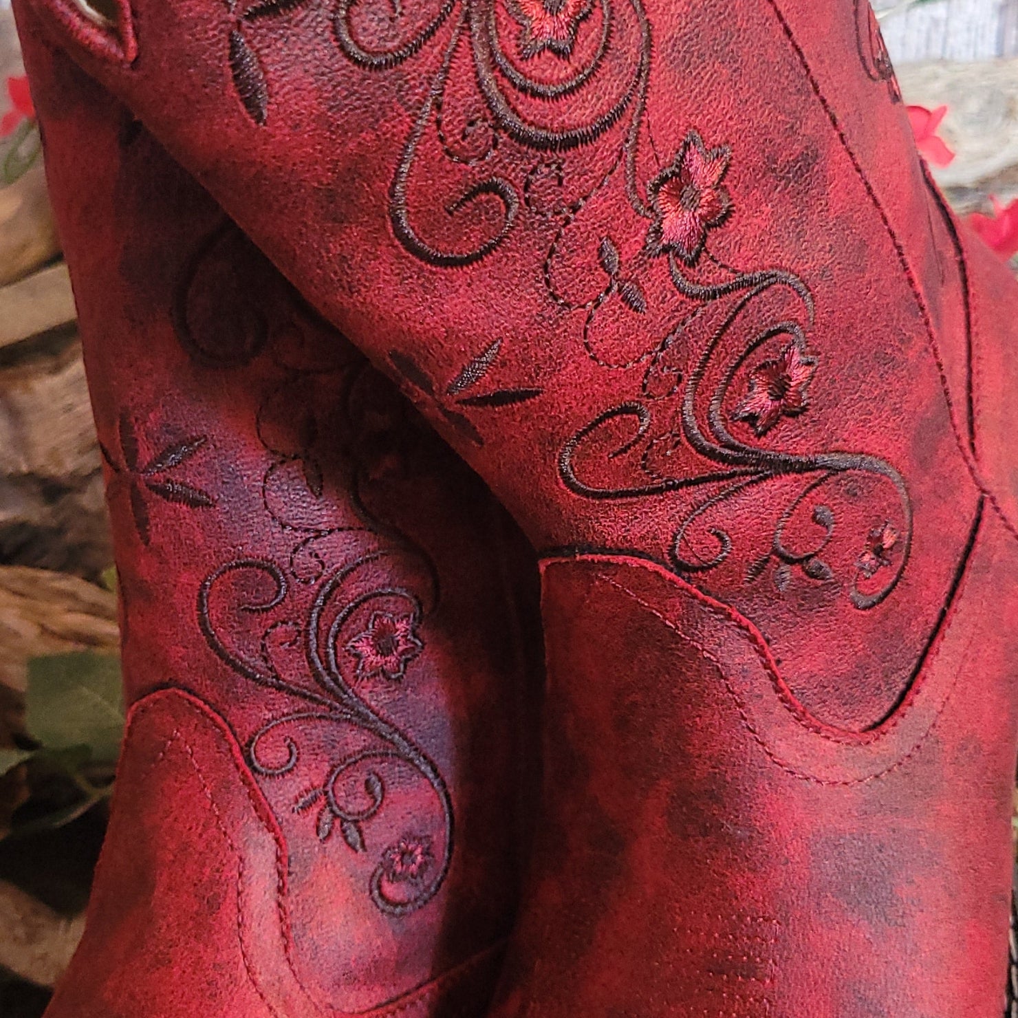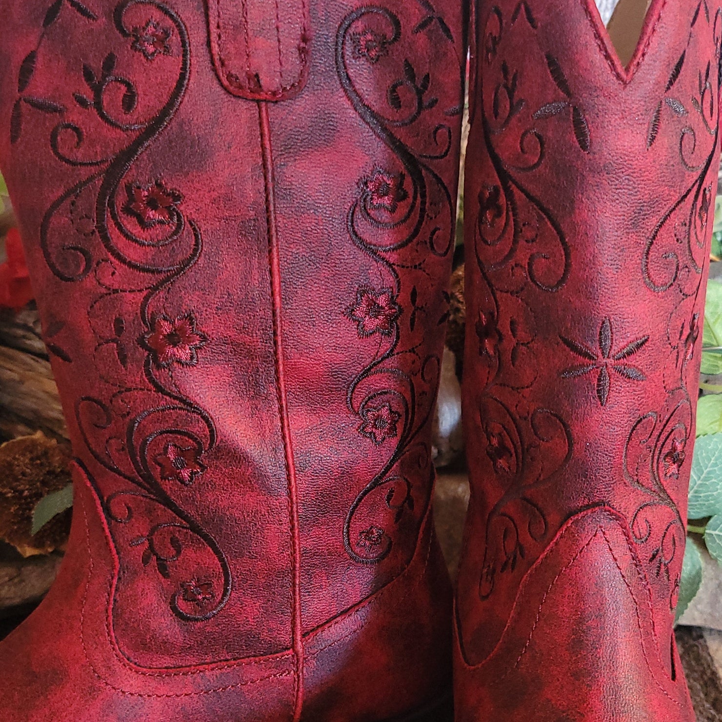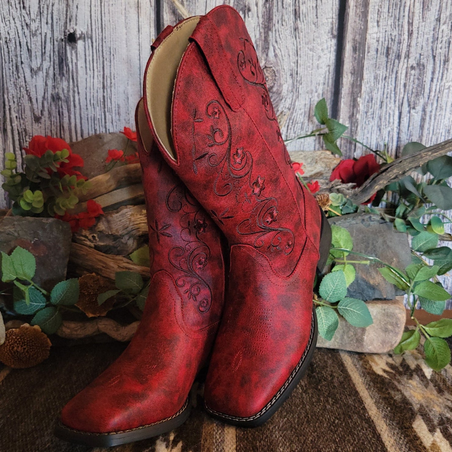 The "Bailey" boot from Roper delivers authentic western style with rich red leather and intricate stitched detailing that captures the spirit of classic ranch wear. The square toe construction provides a traditional silhouette while ornate embroidery adds distinctive character to every step.