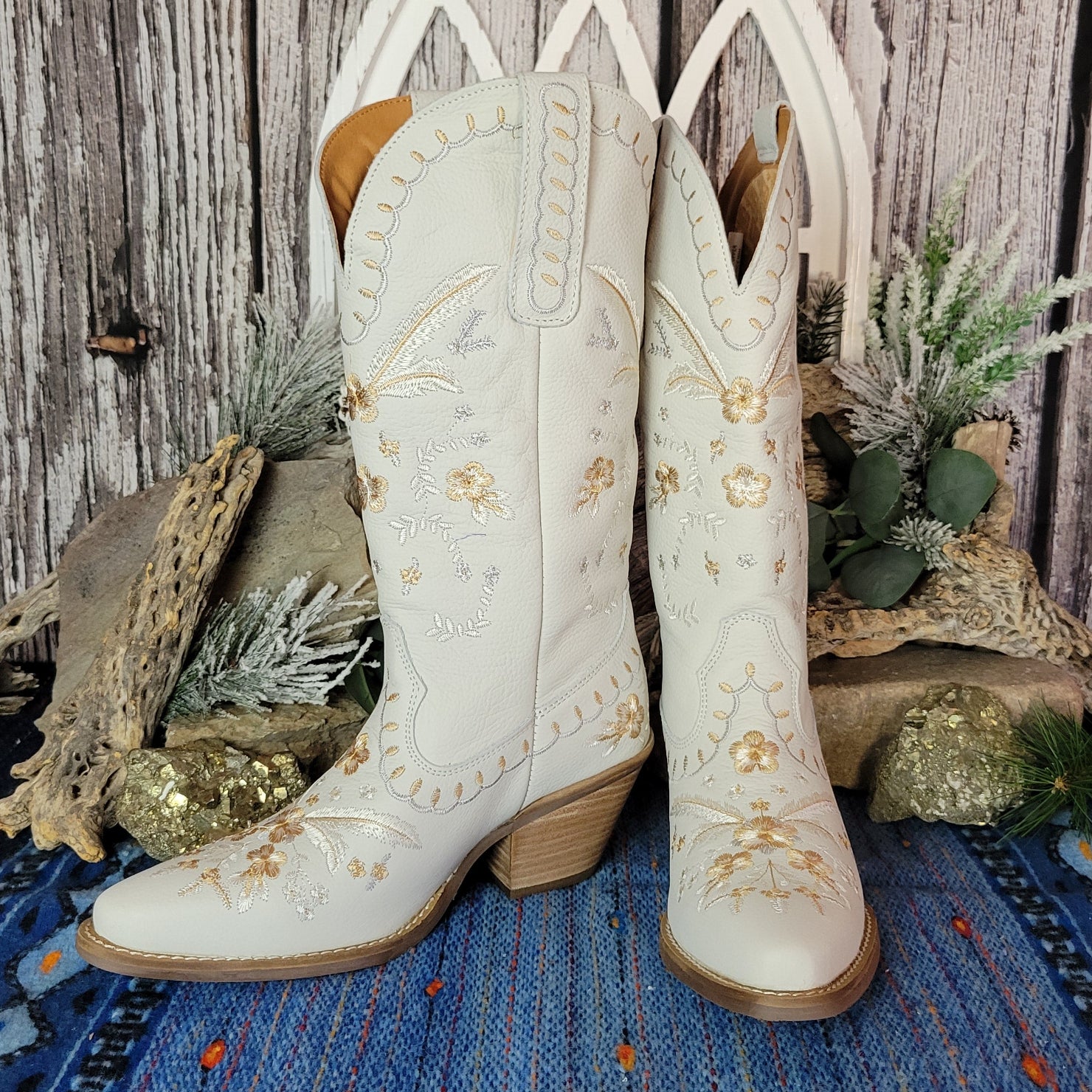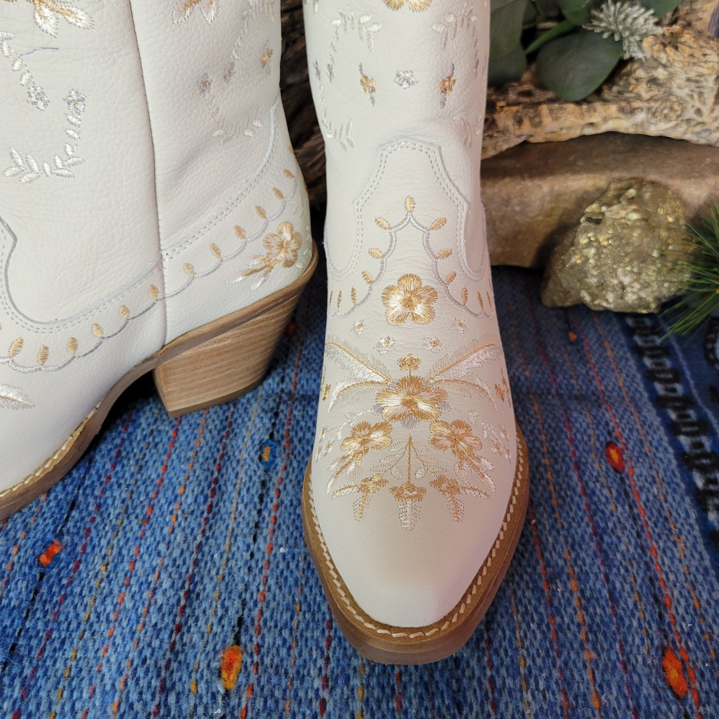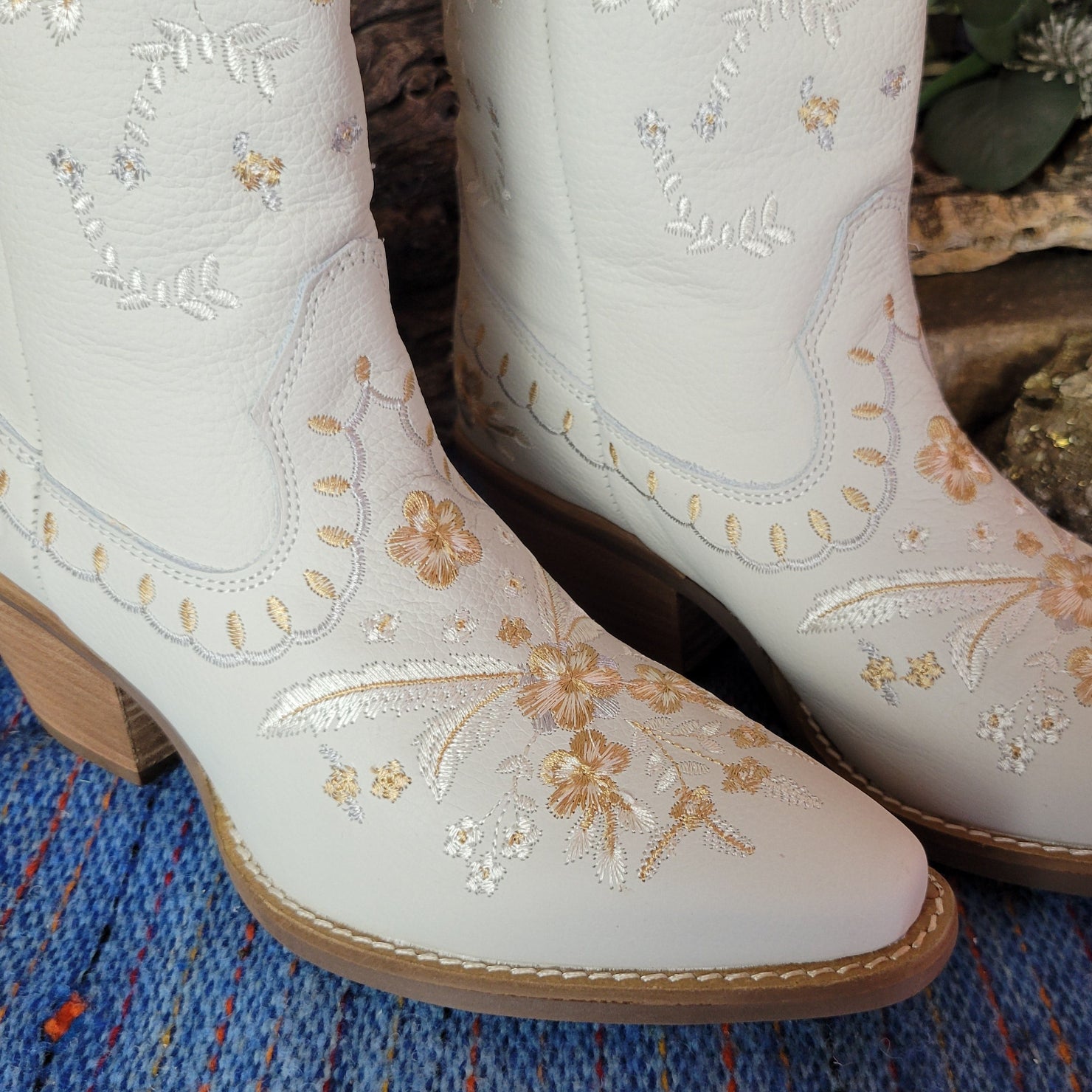 The "Full Bloom" leather boots by Dingo radiate feminine western charm with pristine white leather and a snip toe complemented by vibrant orange stitched floral designs. These boots celebrate the beauty of the frontier while offering the quality construction and comfort.