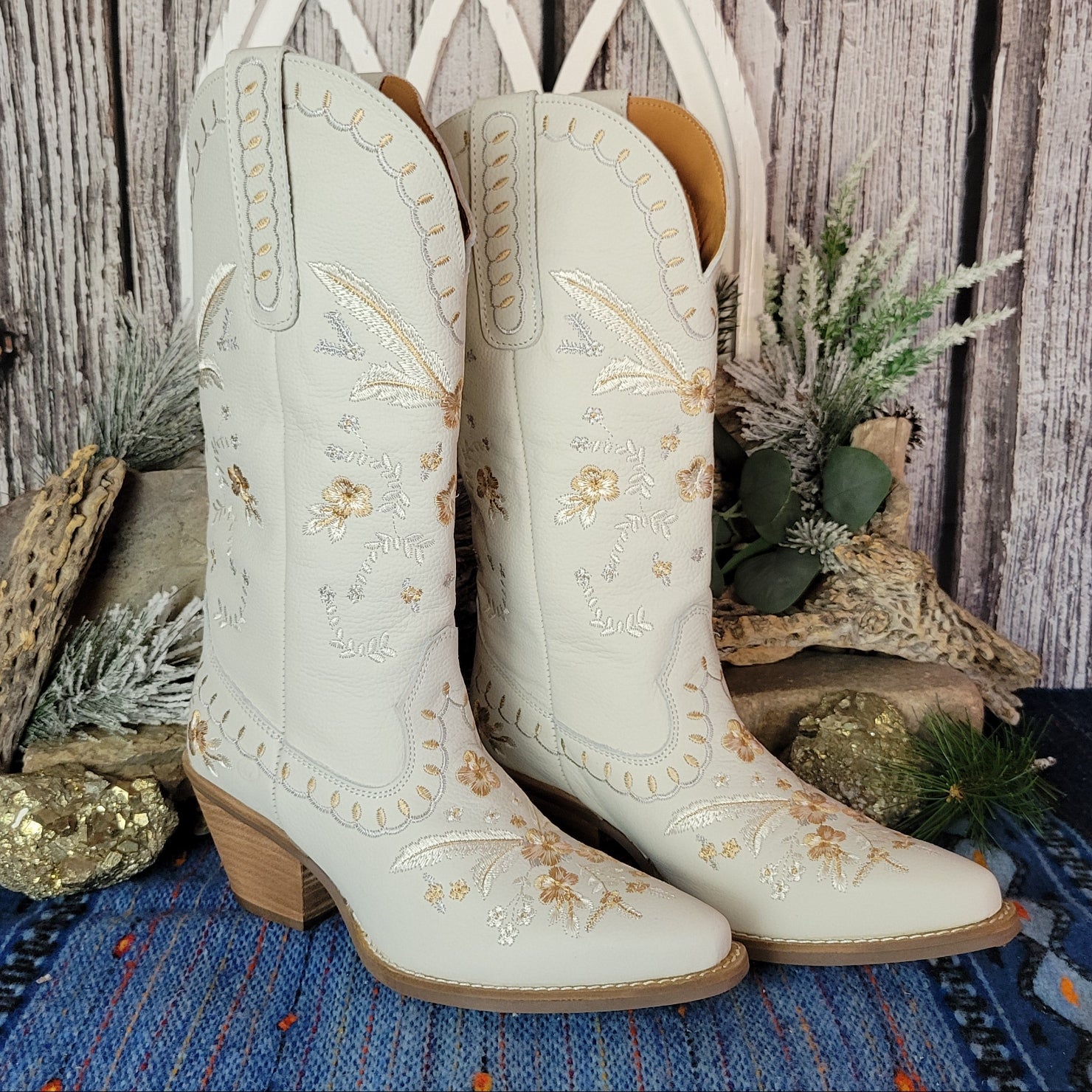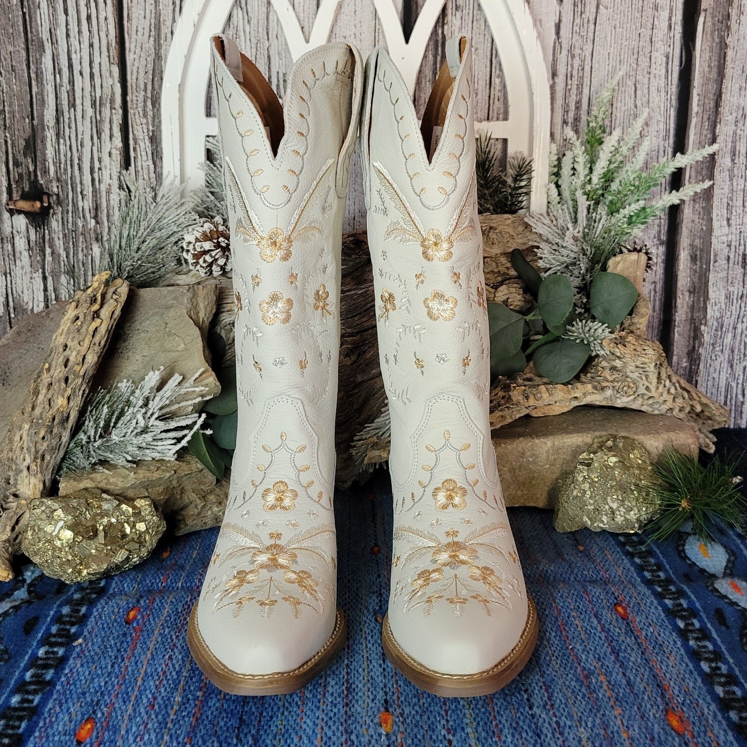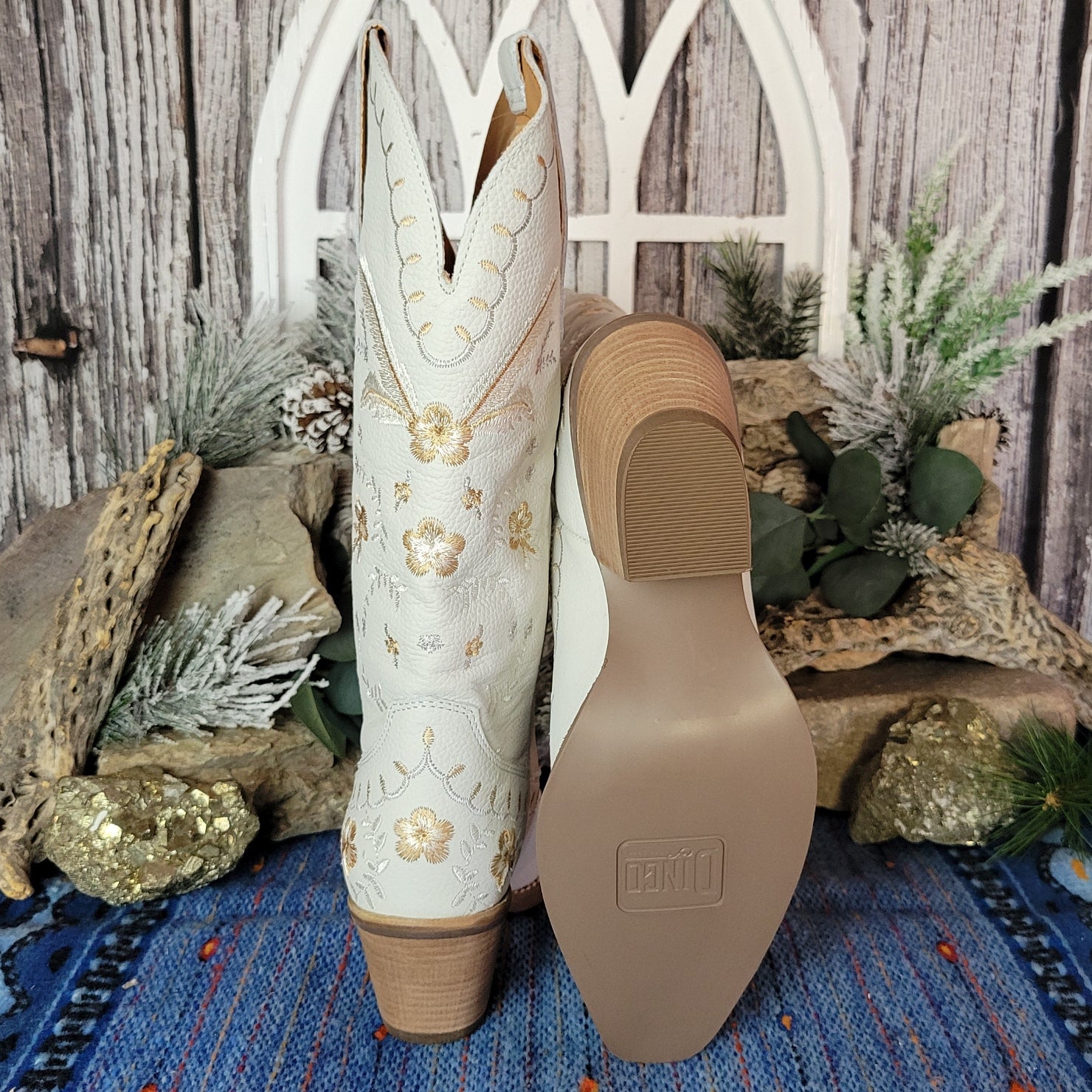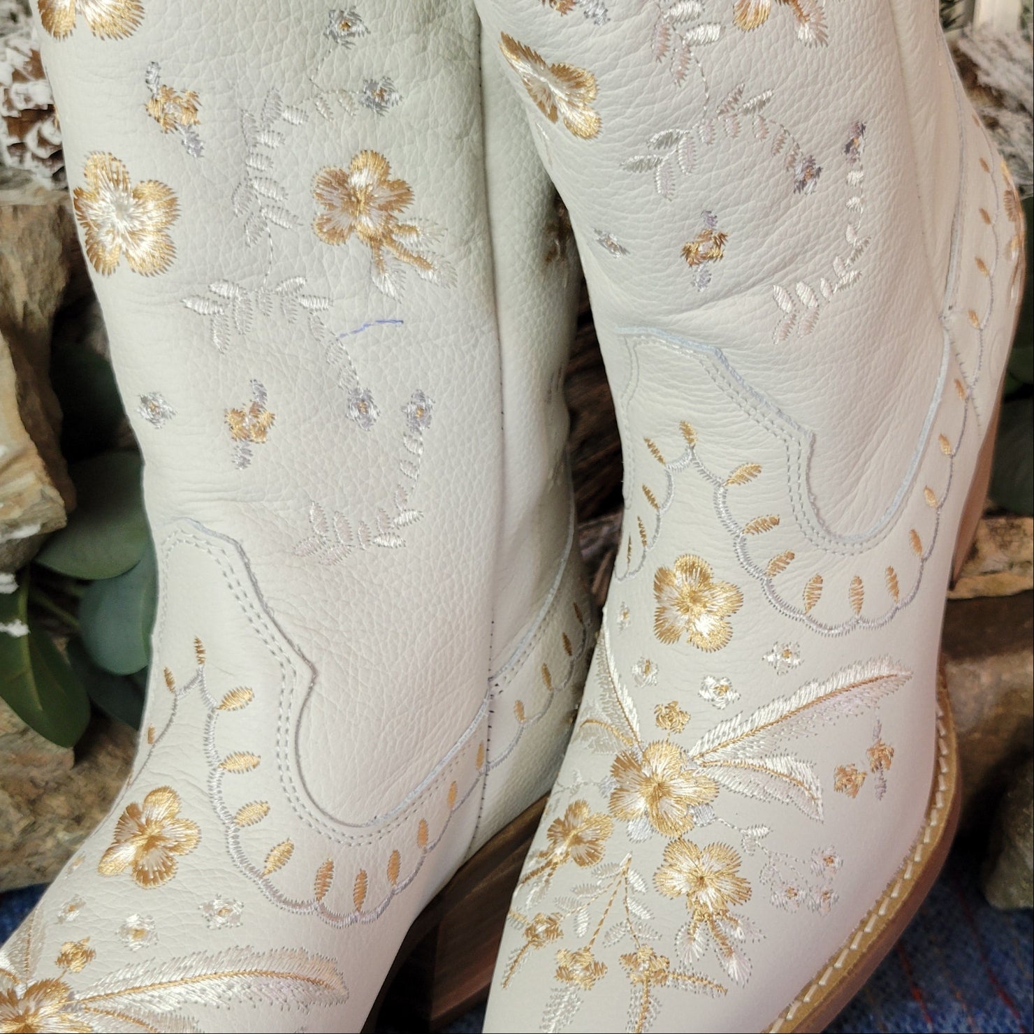 The "Full Bloom" leather boots by Dingo radiate feminine western charm with pristine white leather and a snip toe complemented by vibrant orange stitched floral designs. These boots celebrate the beauty of the frontier while offering the quality construction and comfort.