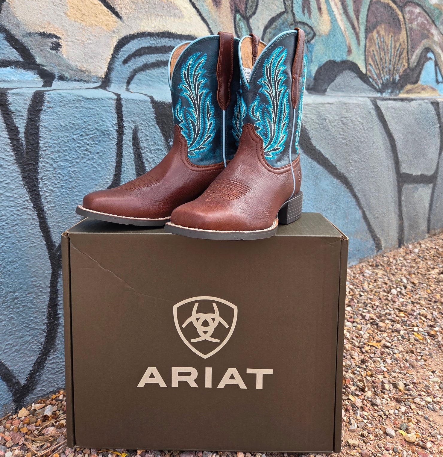 The women's leather boots, "Round Up Filly", by Ariat features a classic brown leather toe paired with a decorative blue shaft, adding to the unique design. The rubber outsole ensures reliable traction and durability, making these boots well-suited for both everyday wear on the trails.