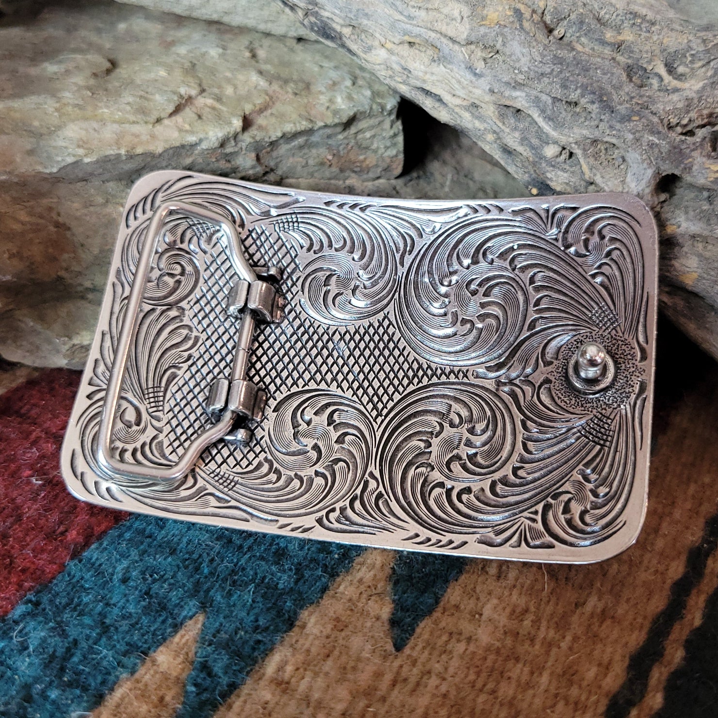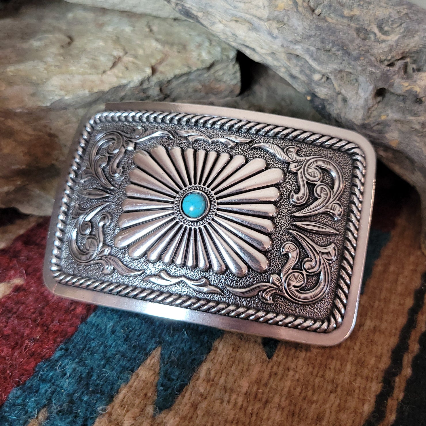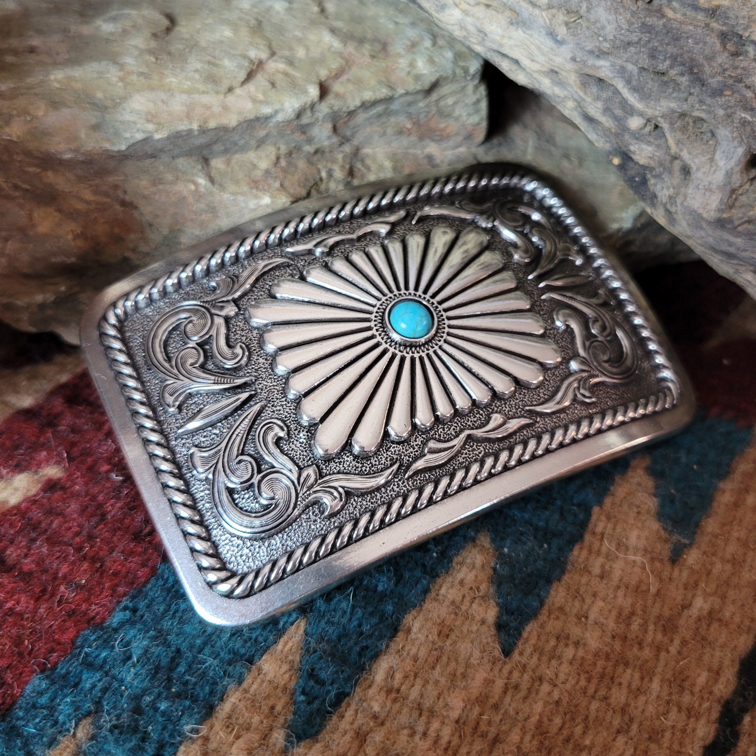 The turquoise concho belt buckle by AndWest blends southwestern elegance with western authenticity through its antique silver finish over zinc and striking turquoise concho centerpiece.