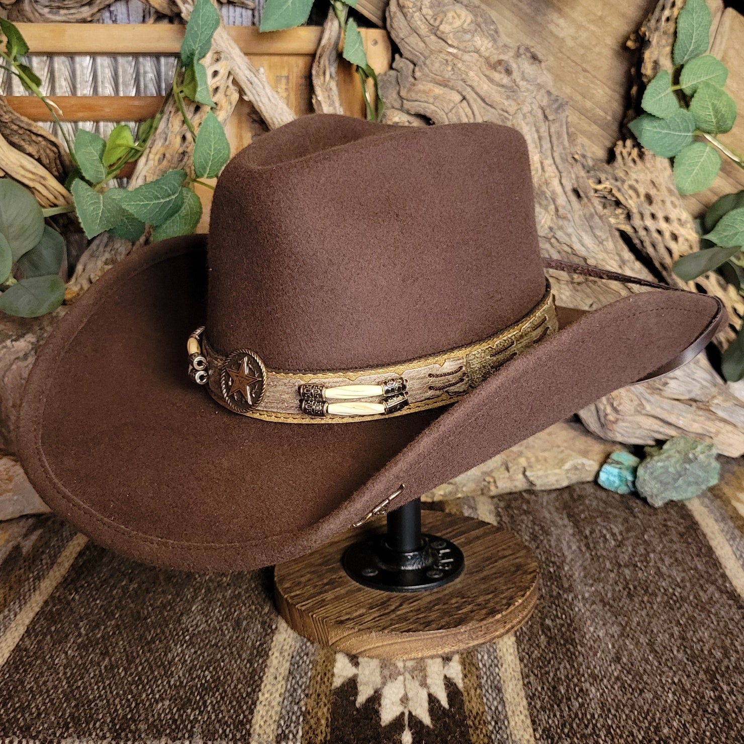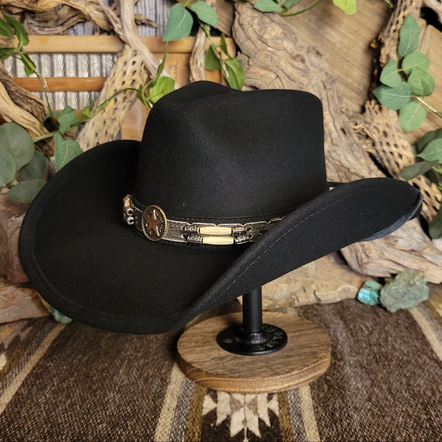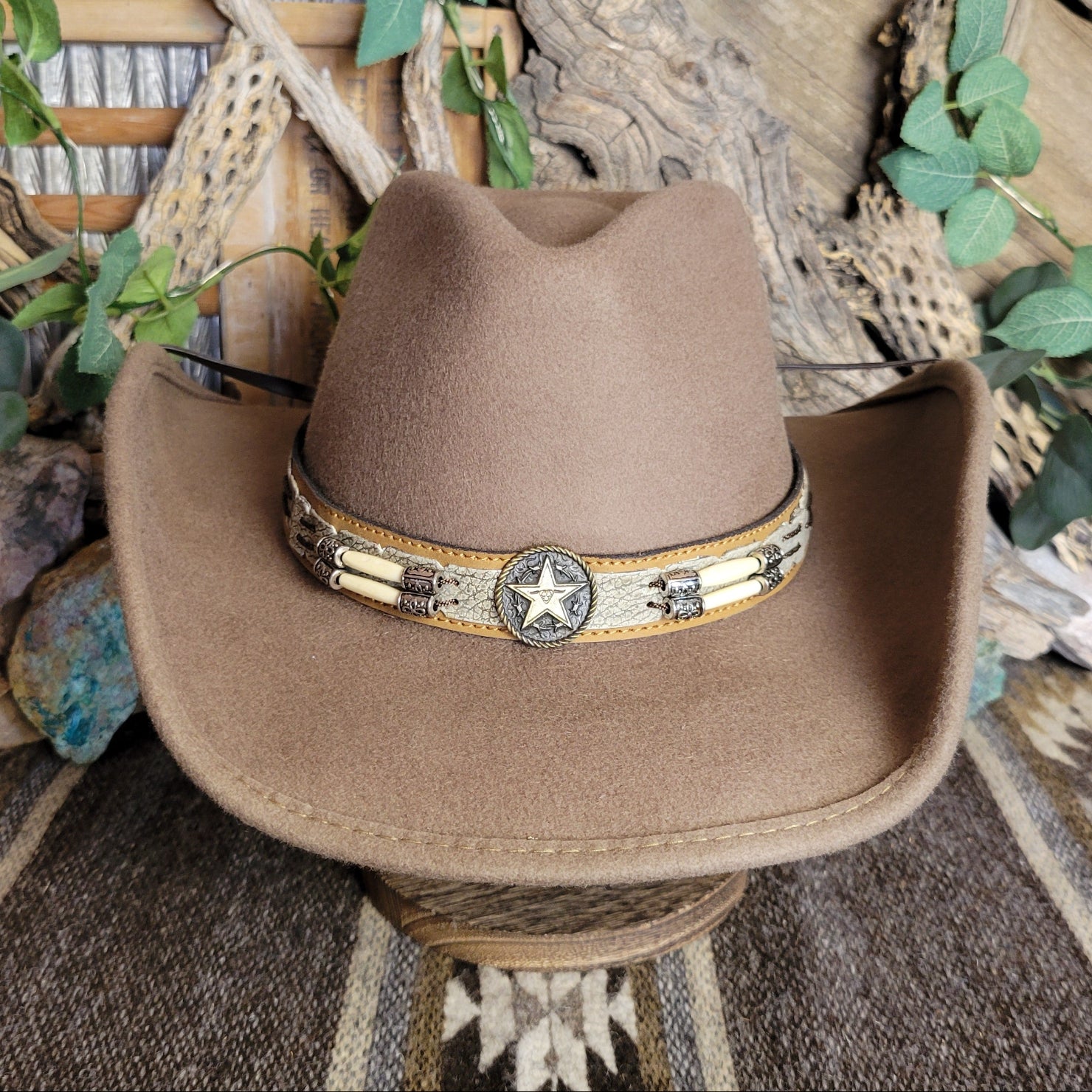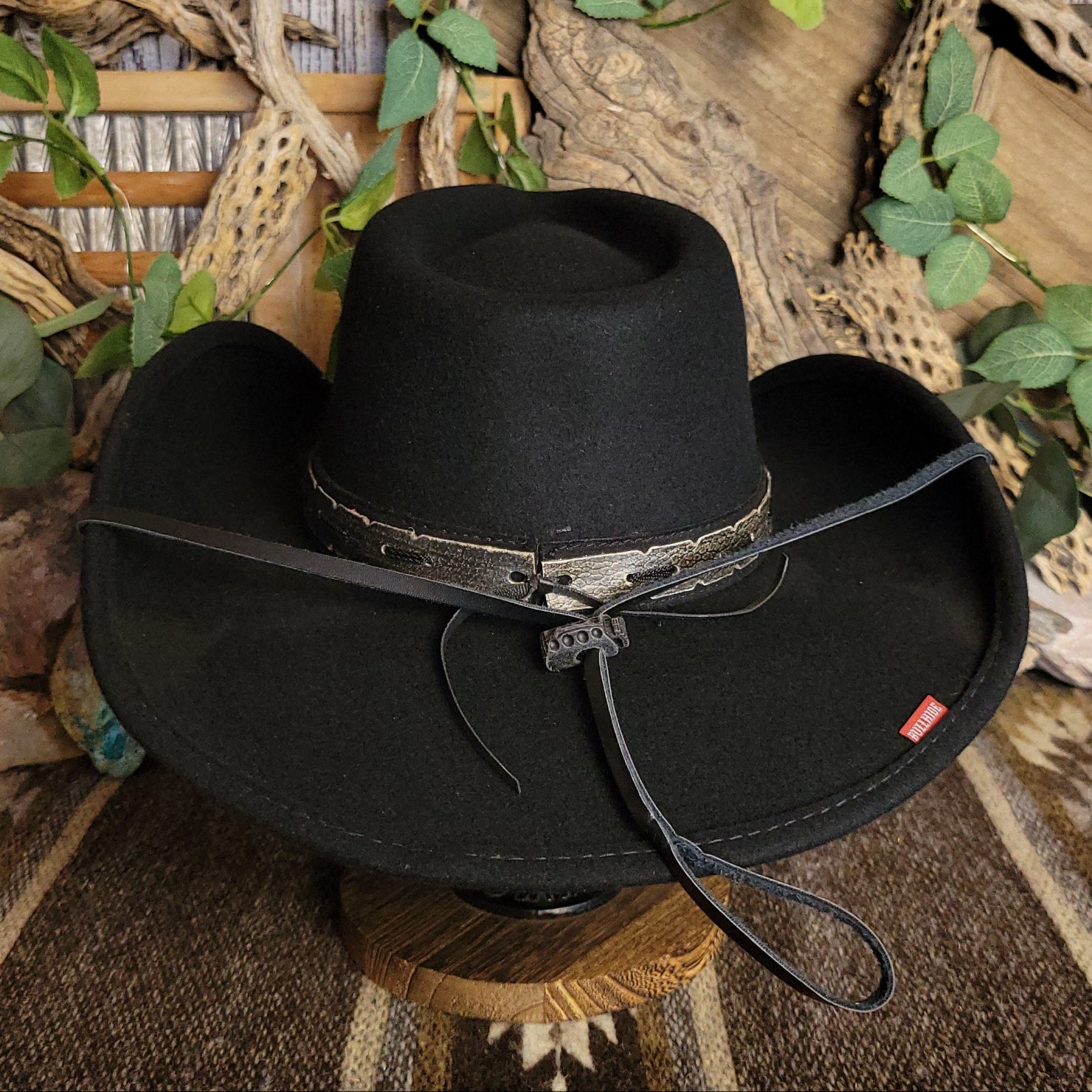 The "Skynard" by Bullhide has a wire brim that allows for easy re-shaping. The Skynard features a stampede string for windy days, lightweight and softer than most felted hats. The hatband is ornate leather with bone and blackened silver embellishments. This hatband also features a star with a longhorn surrounded in a ropelike circle.