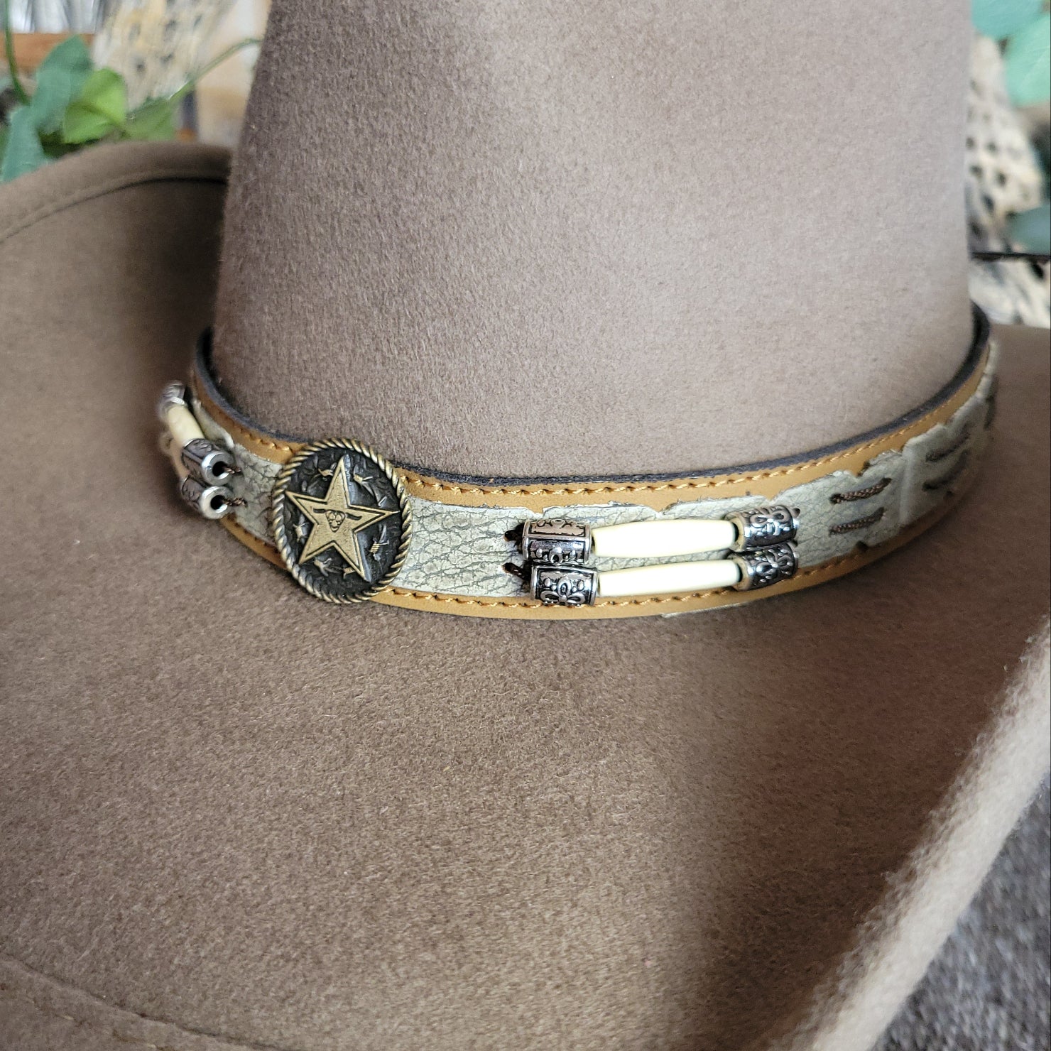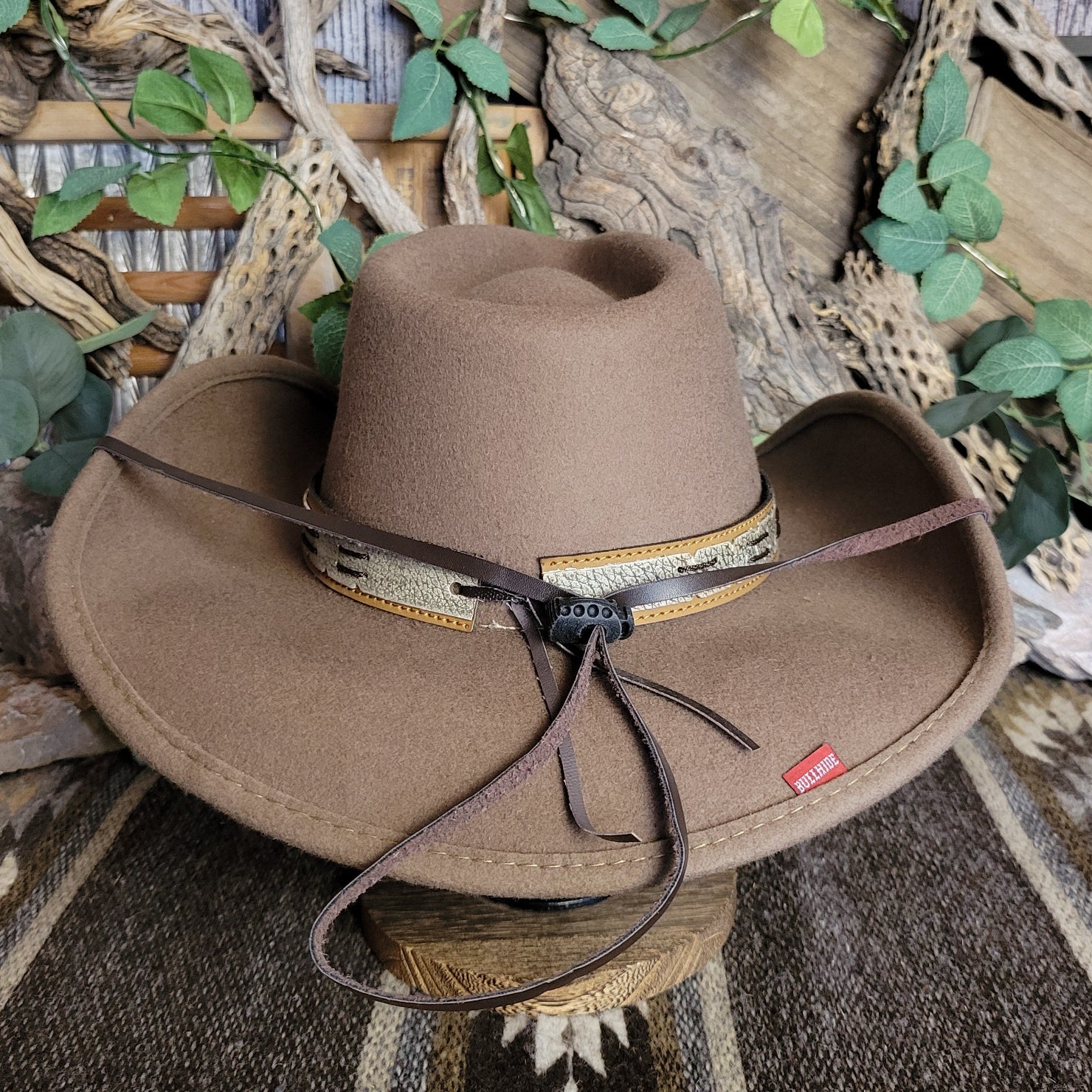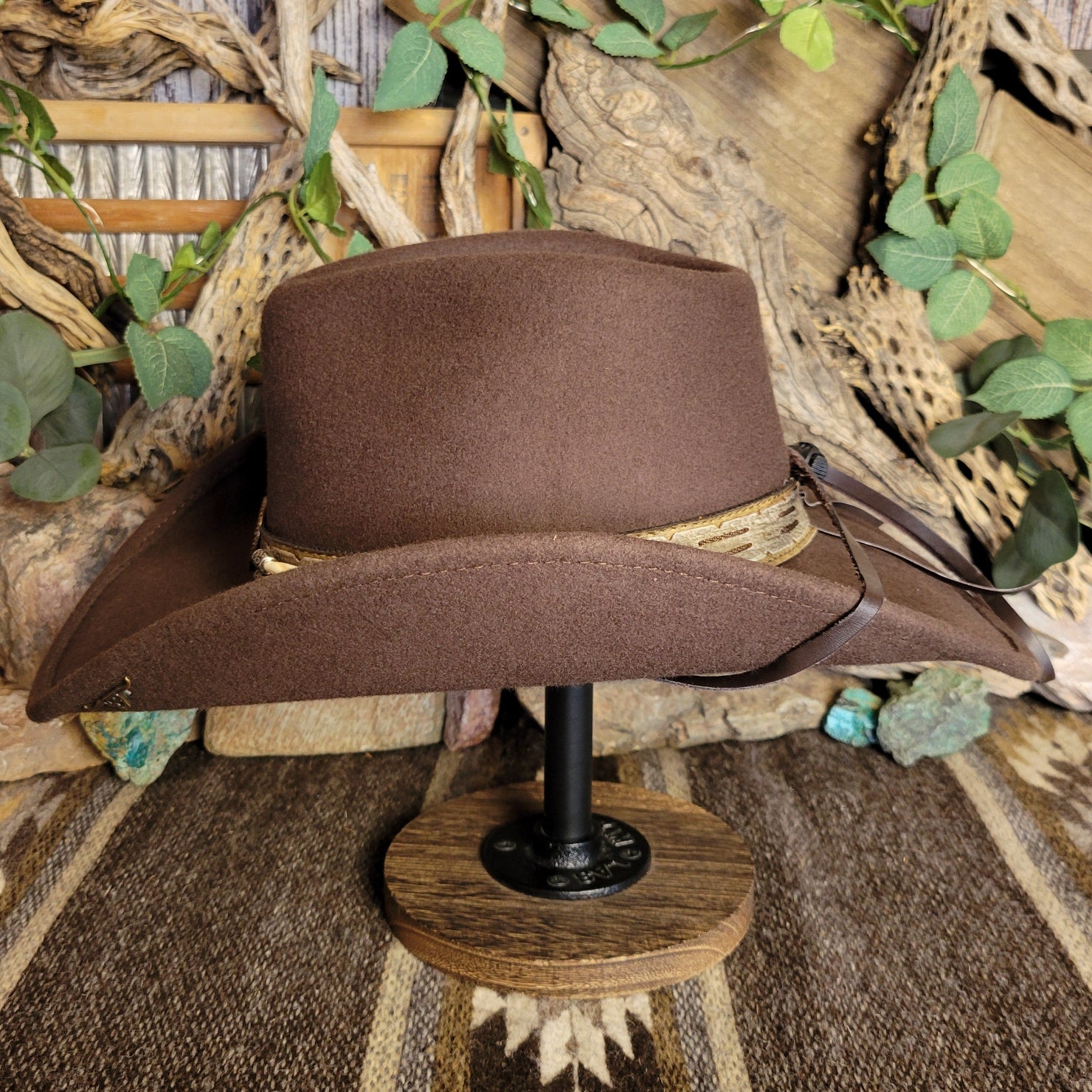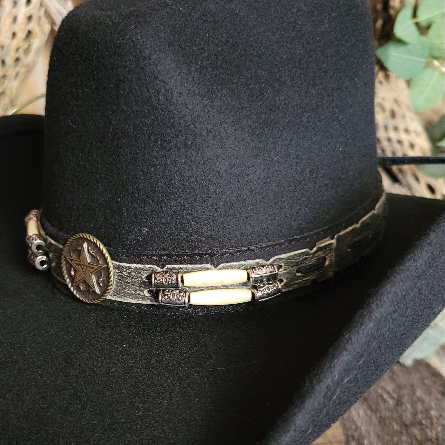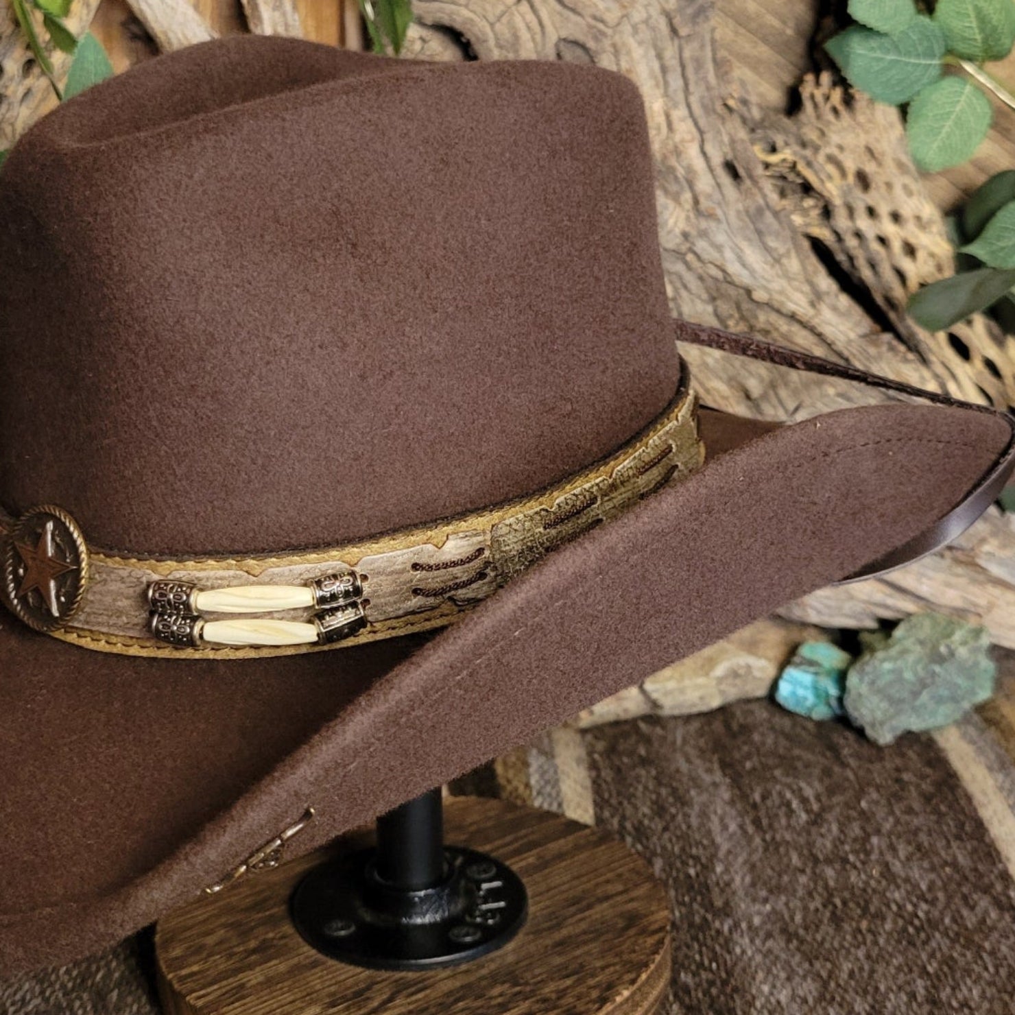 The "Skynard" by Bullhide has a wire brim that allows for easy re-shaping. The Skynard features a stampede string for windy days, lightweight and softer than most felted hats. The hatband is ornate leather with bone and blackened silver embellishments. This hatband also features a star with a longhorn surrounded in a ropelike circle.
