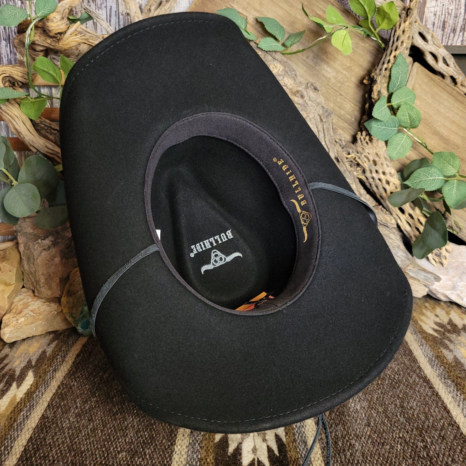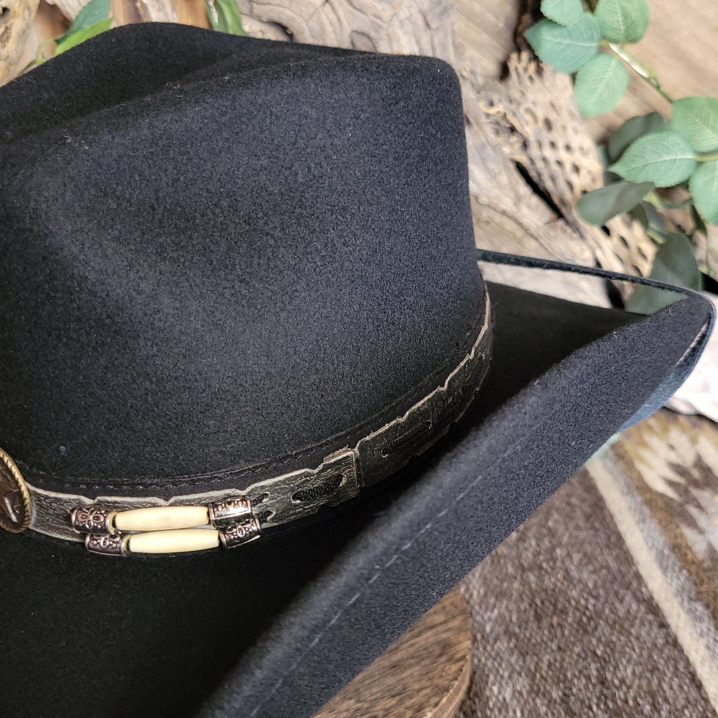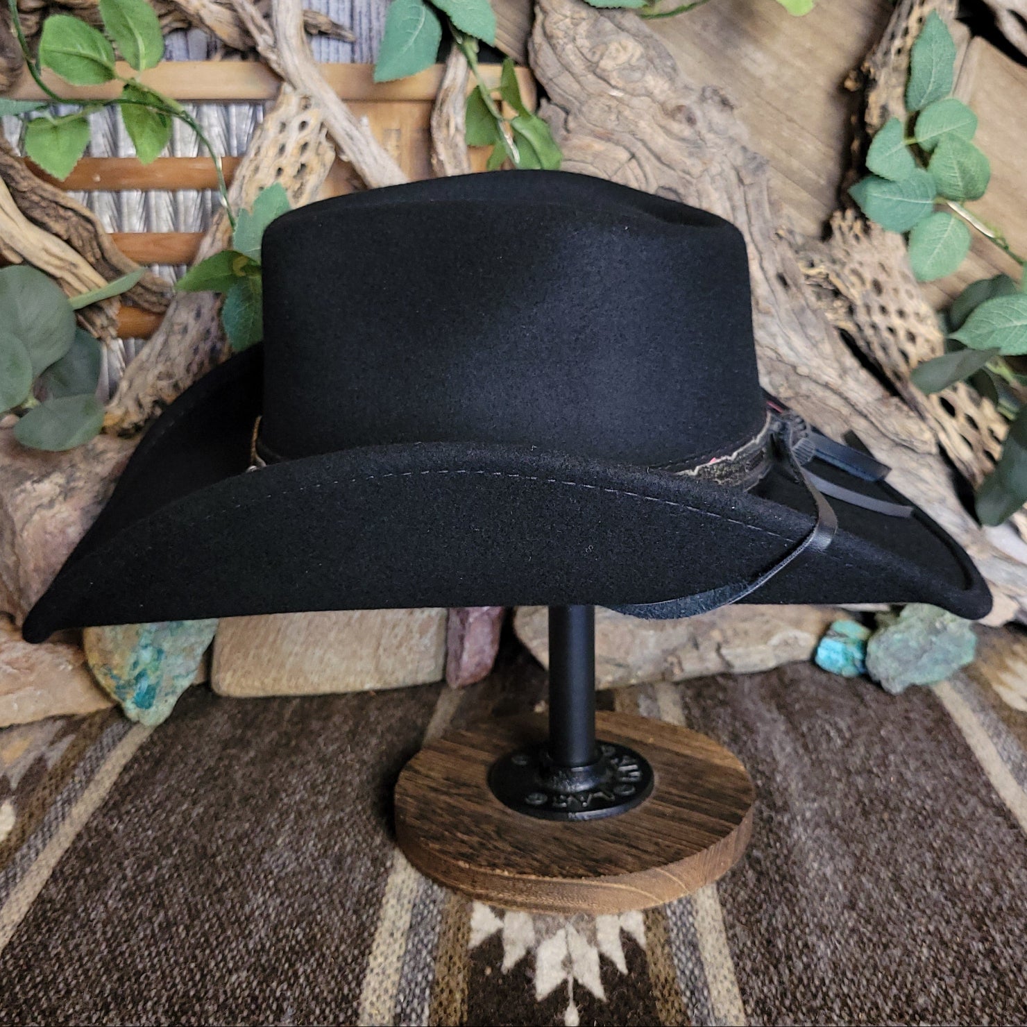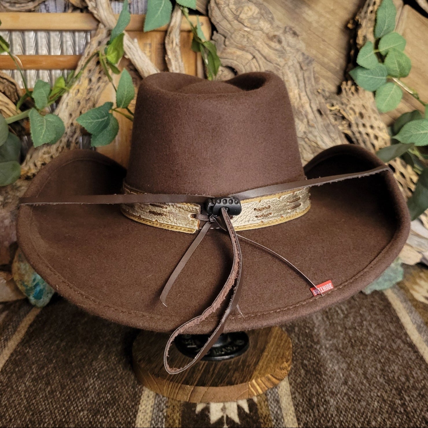 The "Skynard" by Bullhide has a wire brim that allows for easy re-shaping. The Skynard features a stampede string for windy days, lightweight and softer than most felted hats. The hatband is ornate leather with bone and blackened silver embellishments. This hatband also features a star with a longhorn surrounded in a ropelike circle.