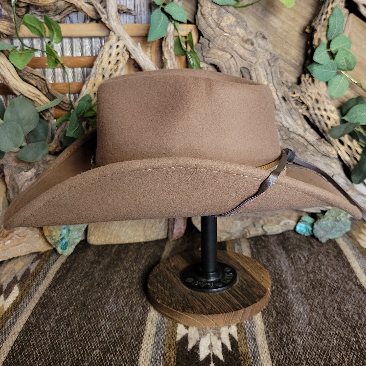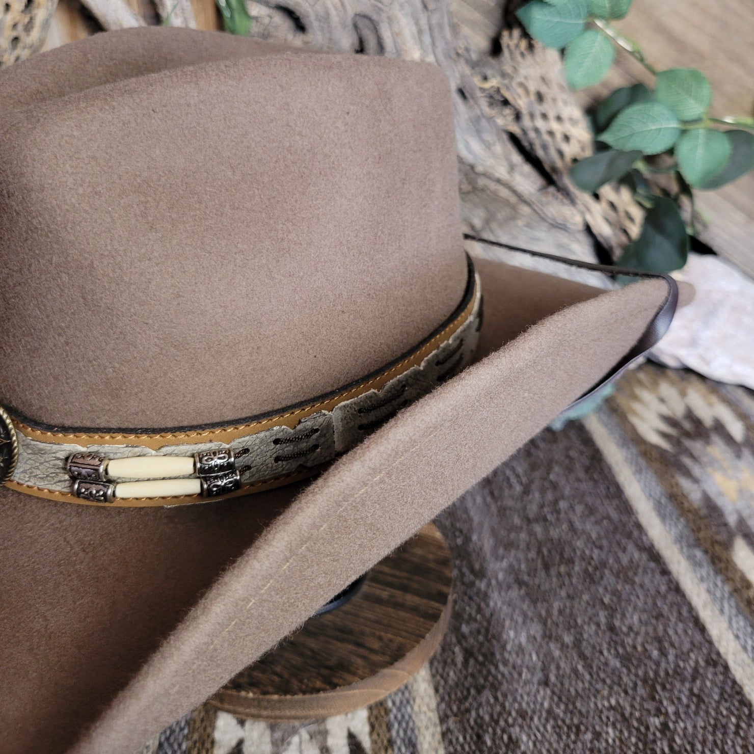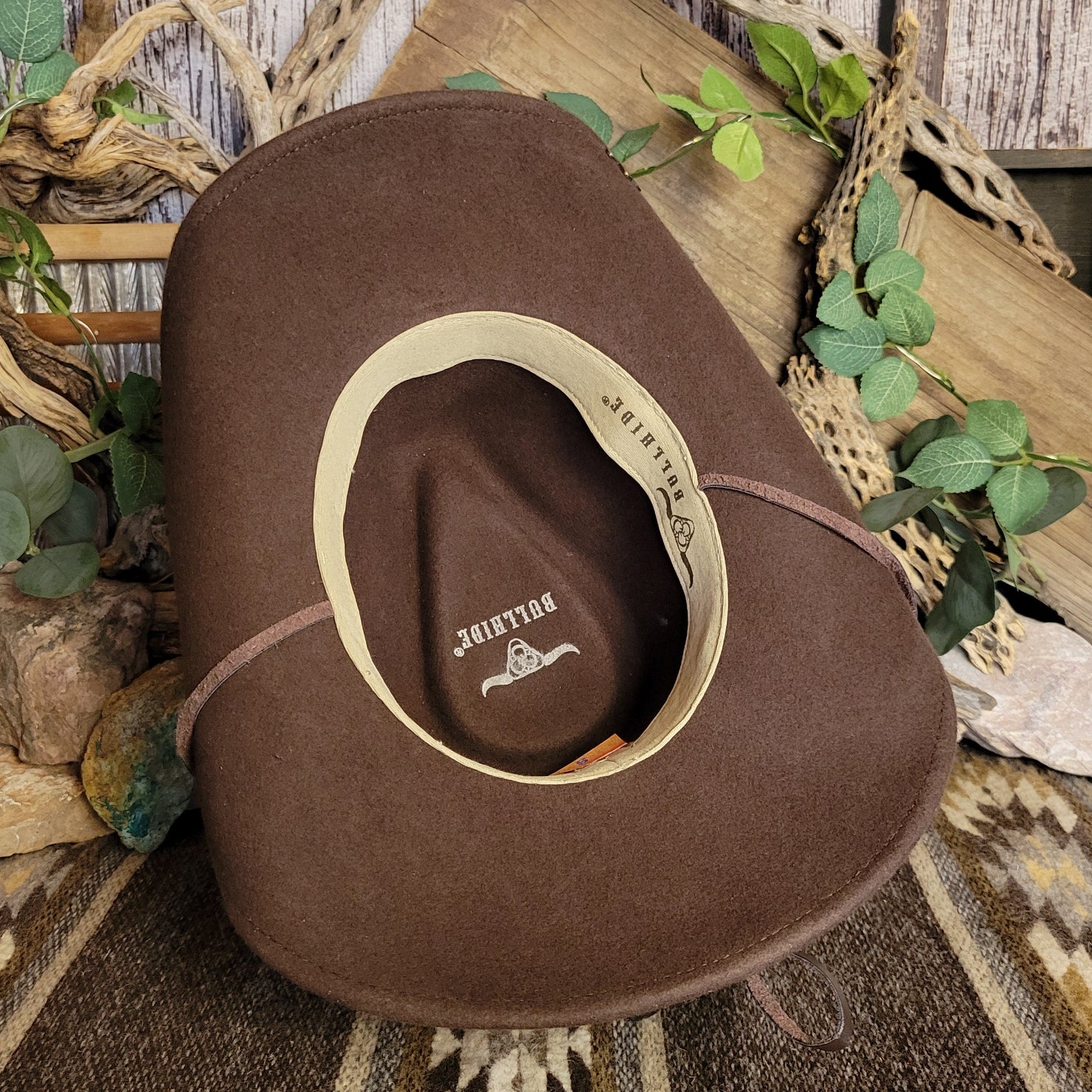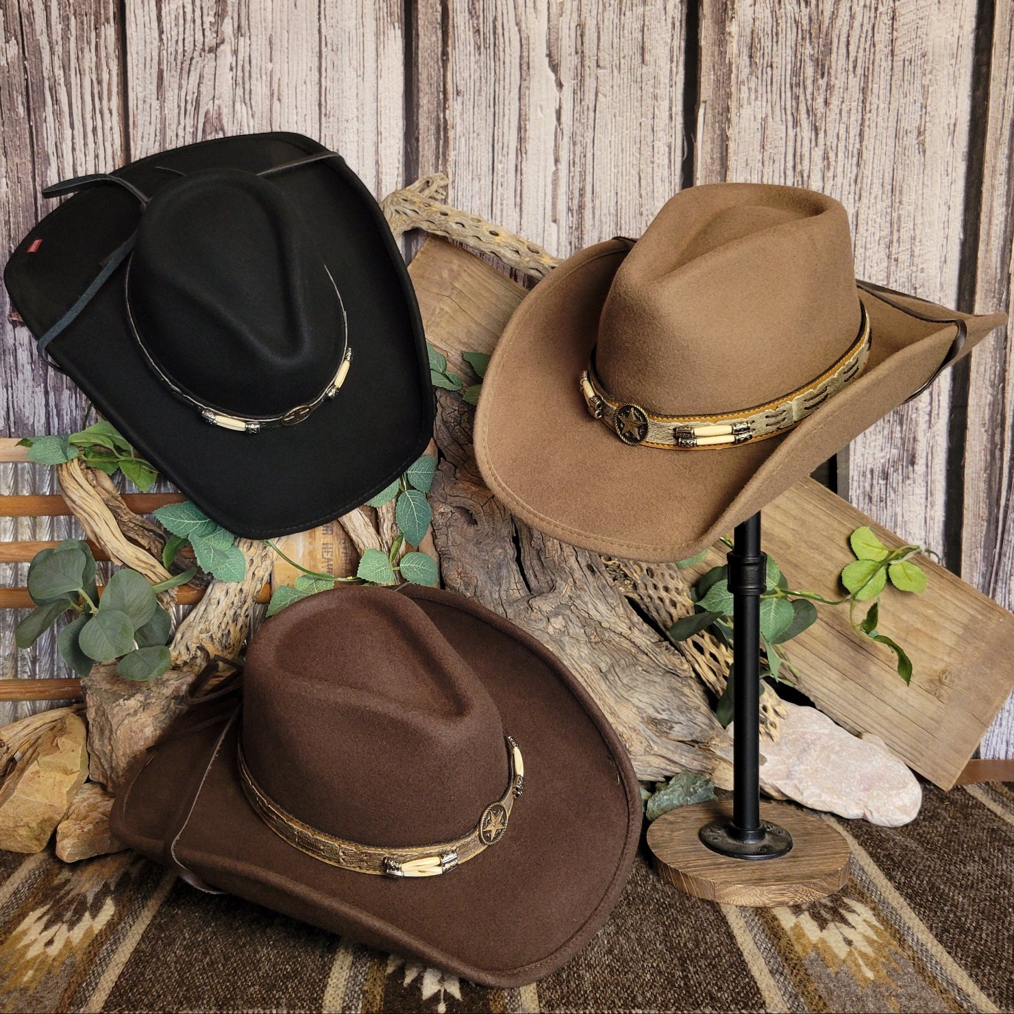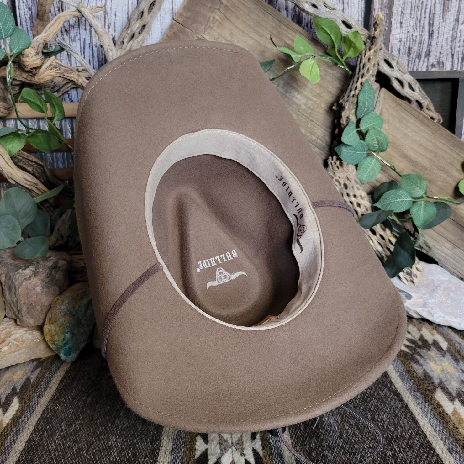 The "Skynard" by Bullhide has a wire brim that allows for easy re-shaping. The Skynard features a stampede string for windy days, lightweight and softer than most felted hats. The hatband is ornate leather with bone and blackened silver embellishments. This hatband also features a star with a longhorn surrounded in a ropelike circle.