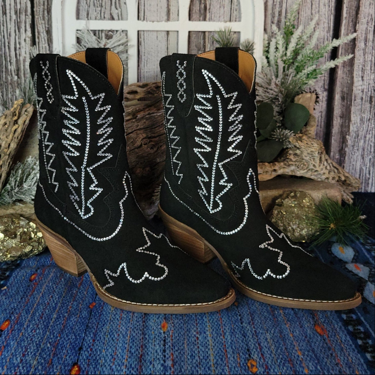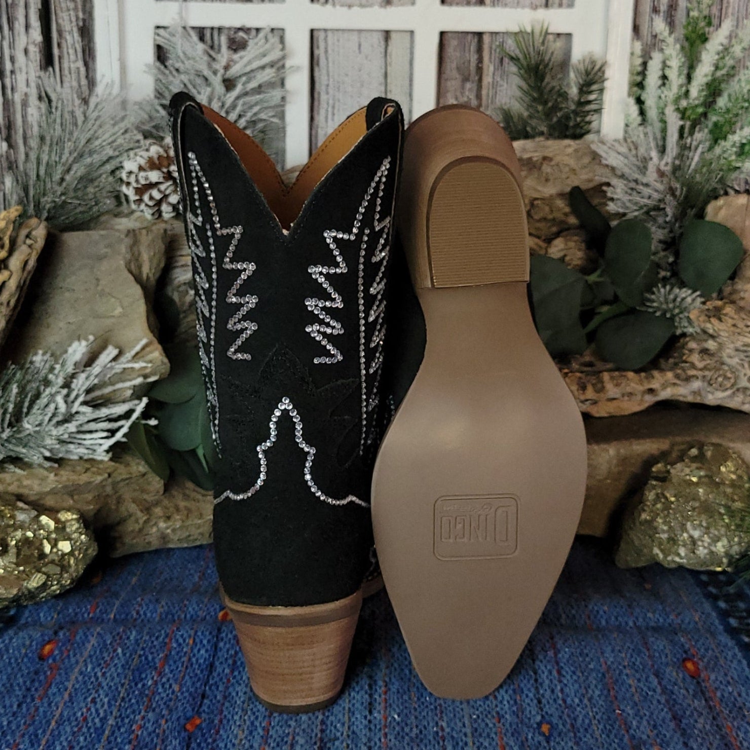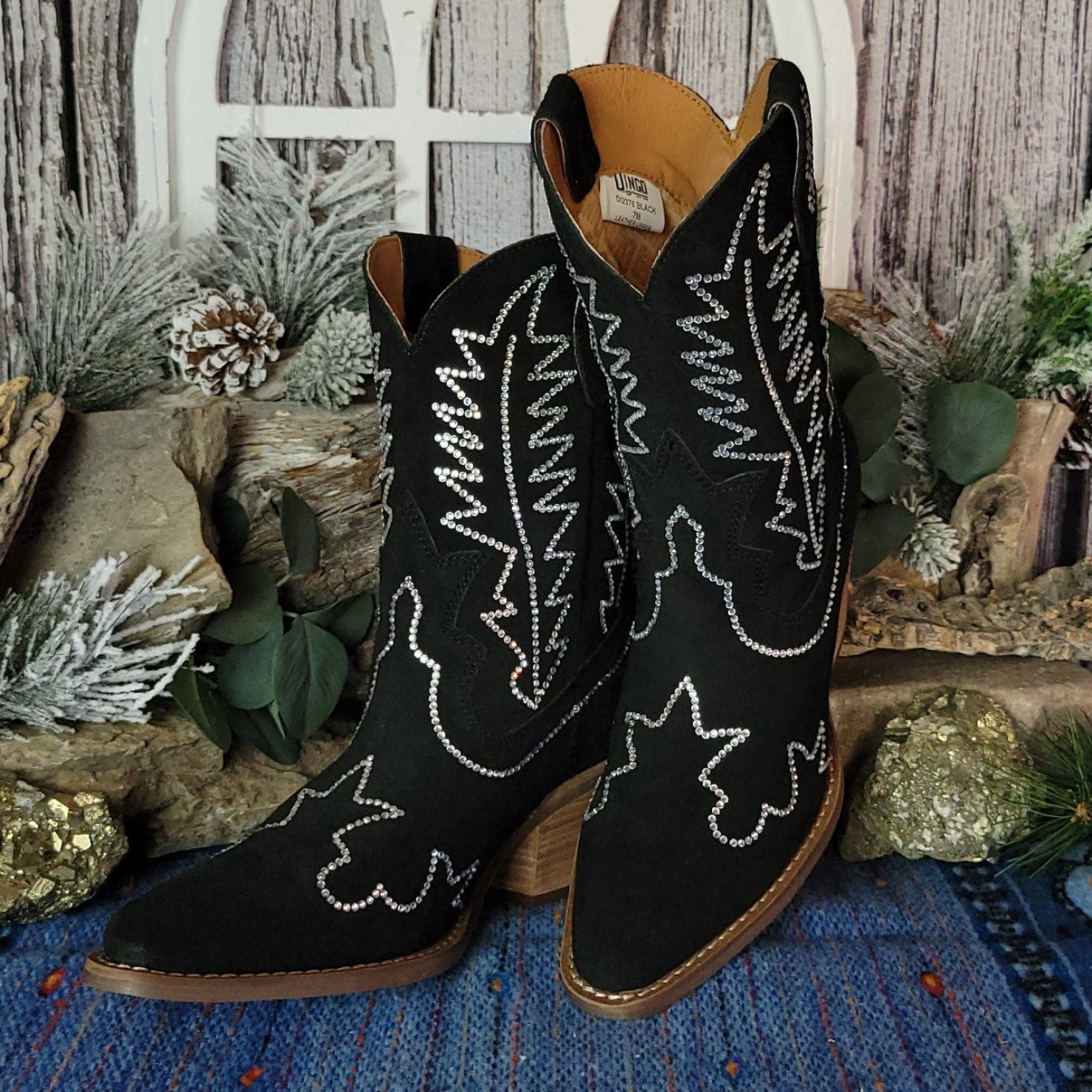 The women's "Tiny Pony" leather boots by Dingo showcase authentic western style with sleek black leather and a snip toe silhouette accented by striking rhinestone designs. Built for women who demand both comfort and character, these boots deliver the classic cowgirl aesthetic.
