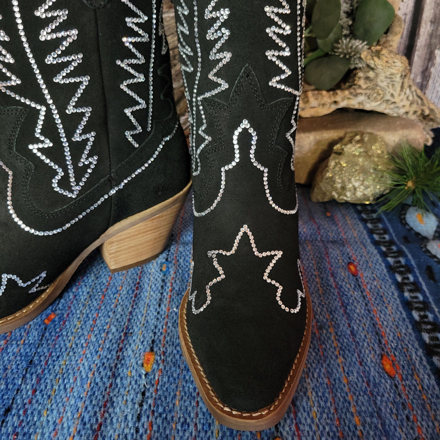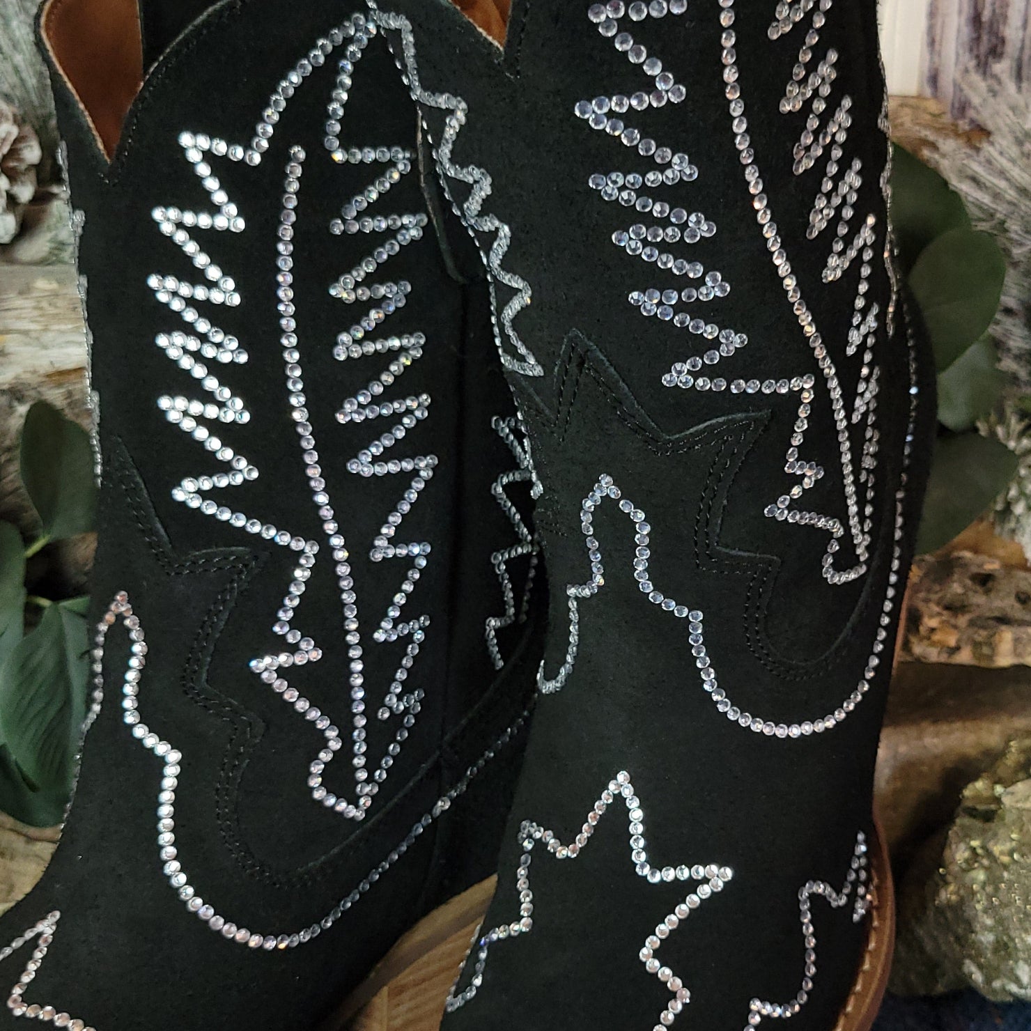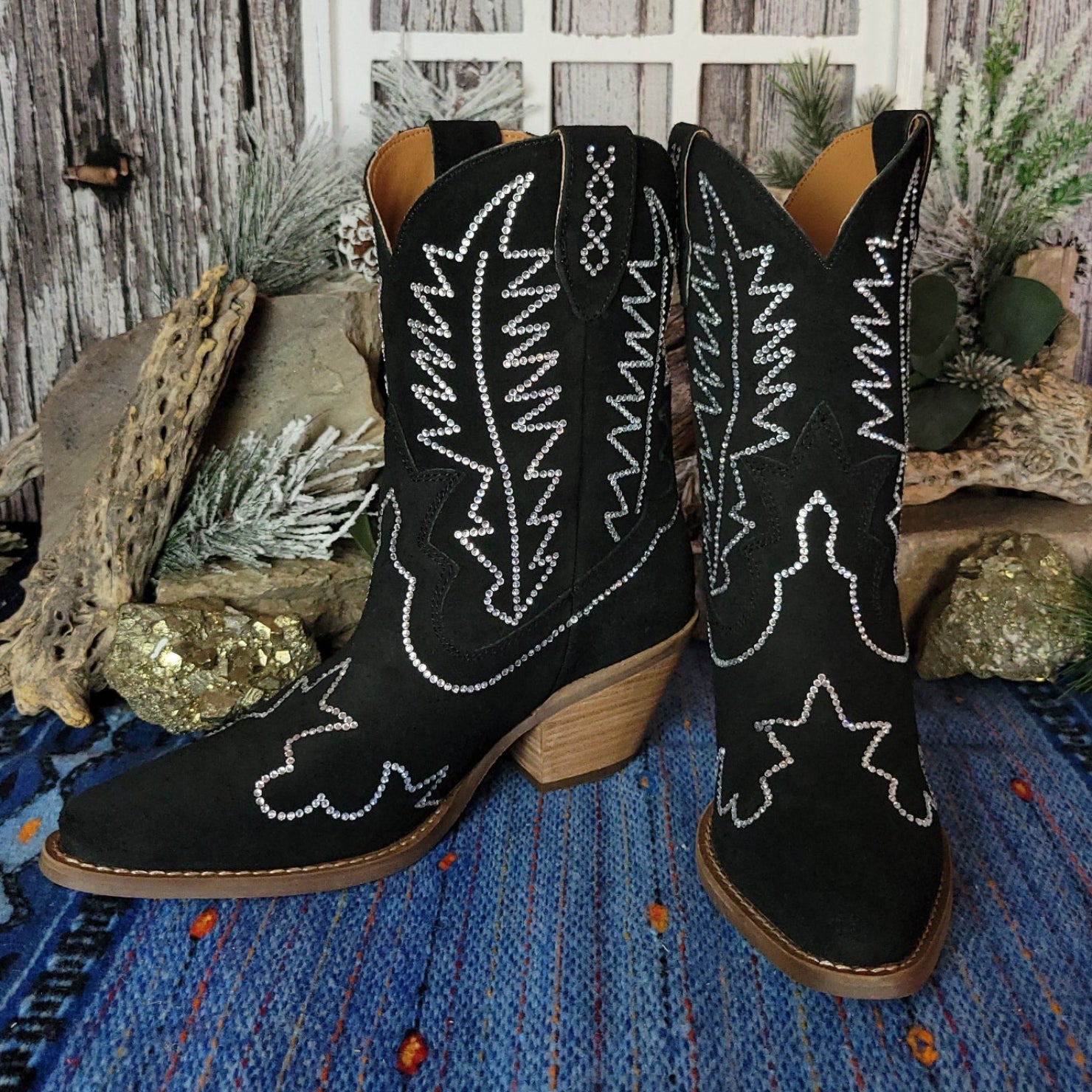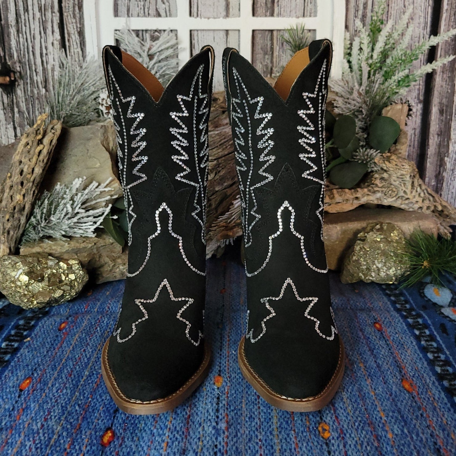 The women's "Tiny Pony" leather boots by Dingo showcase authentic western style with sleek black leather and a snip toe silhouette accented by striking rhinestone designs. Built for women who demand both comfort and character, these boots deliver the classic cowgirl aesthetic.