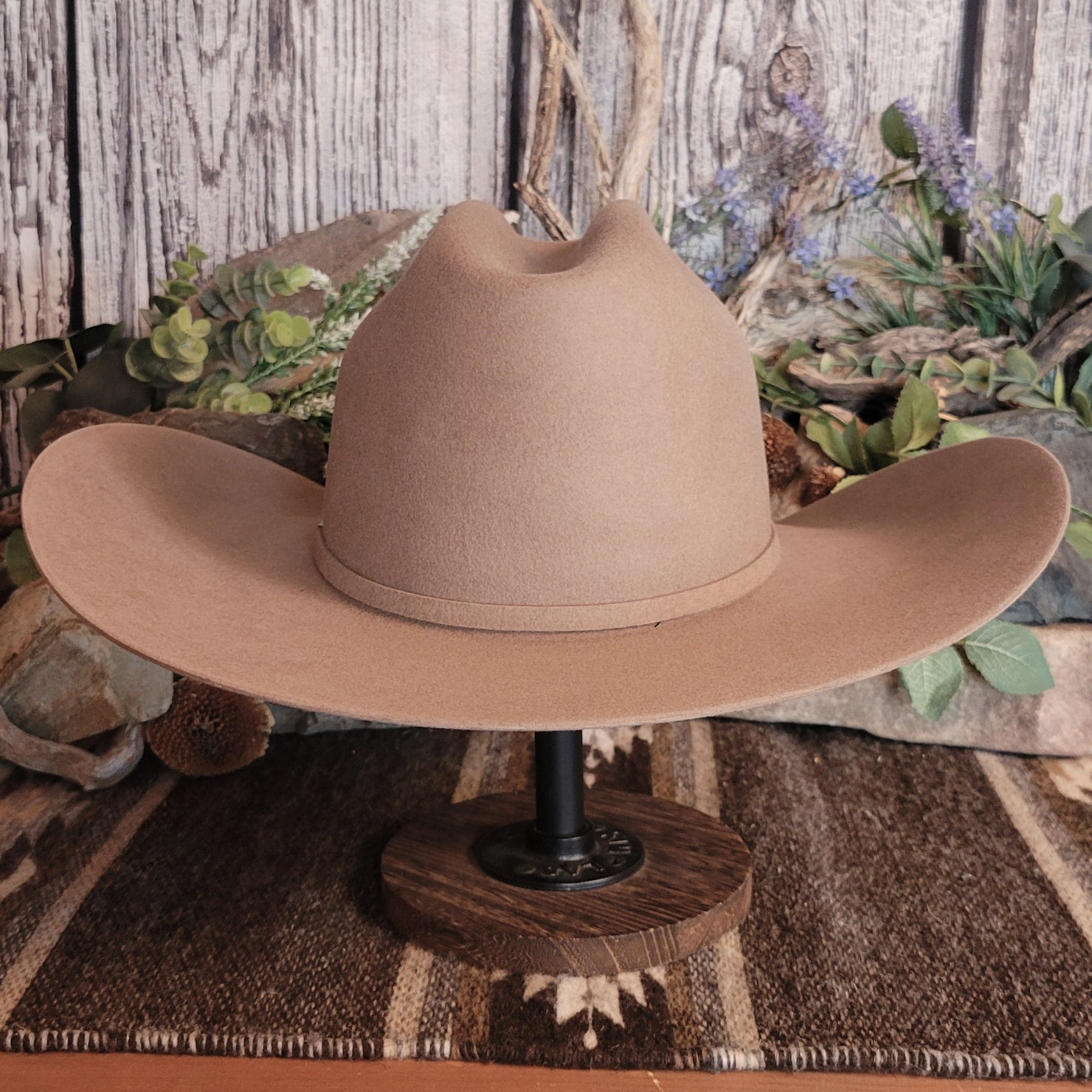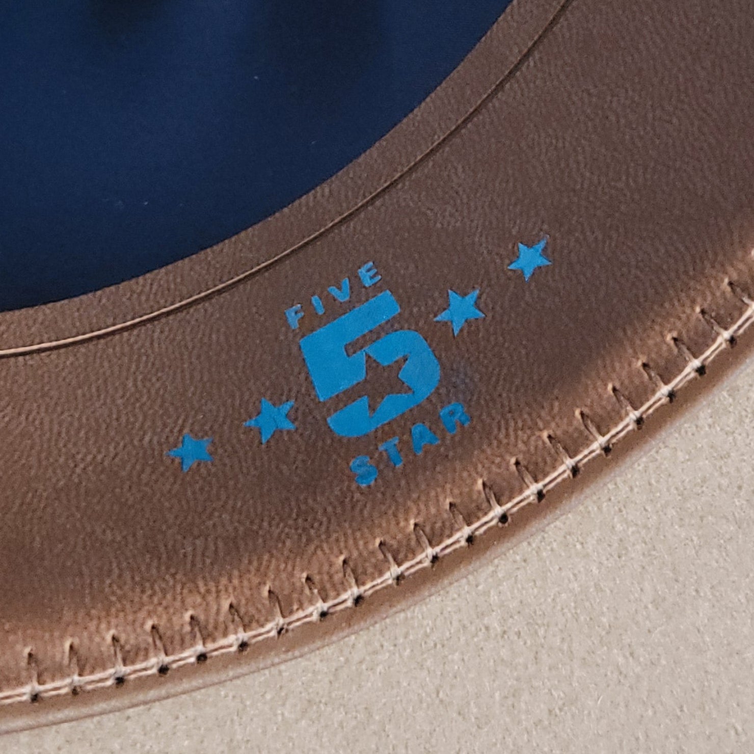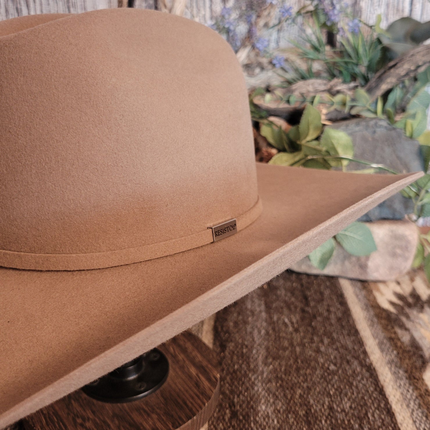 The "Five Star" by Resistol is a premium fur felt hat featuring a beige coloring with a coordinating hat band and striking blue interior lining. This masterfully constructed western hat is perfect for a night out on the town or trail.