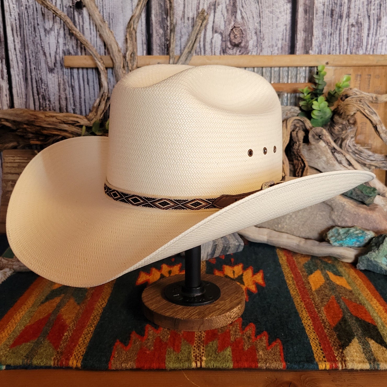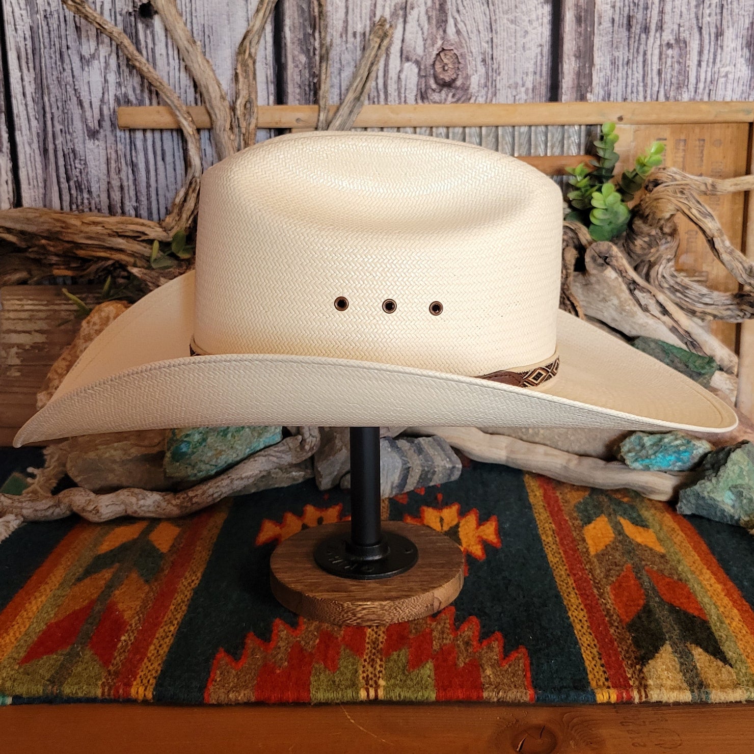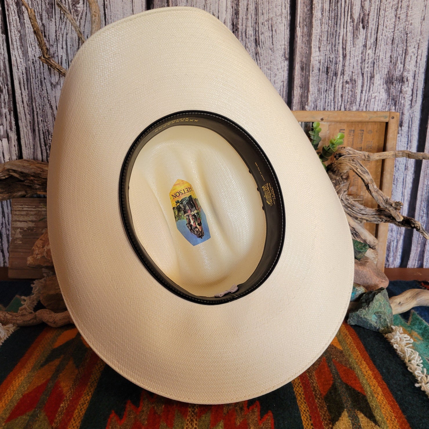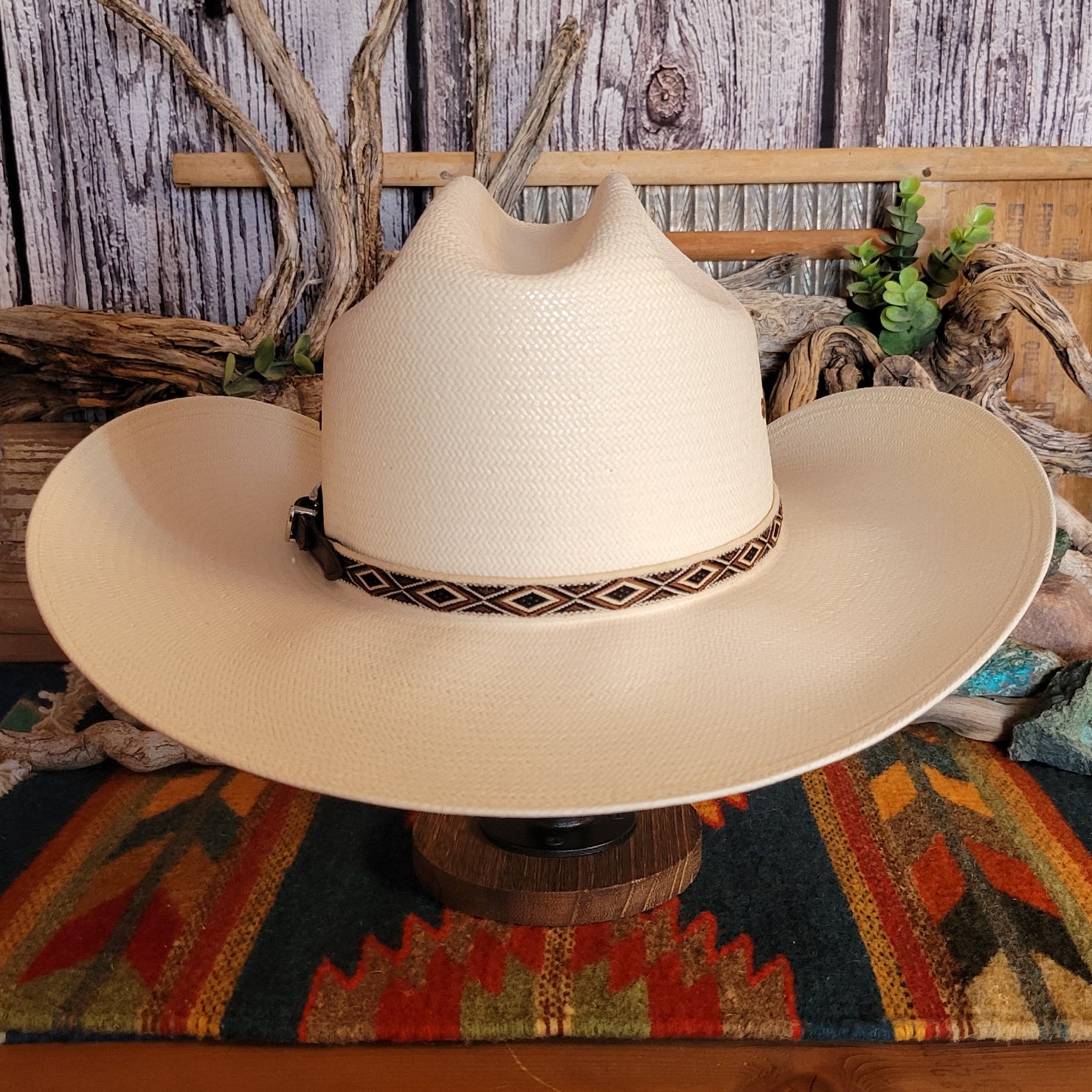 This premium 10X Stetson "Fairfax" straw hat in ivory showcases a signature cattleman's crease crown paired with a diamond hatband. Built from quality straw for breathability and durability, it's the ideal choice for a hard day's ranch work or night on the town.
